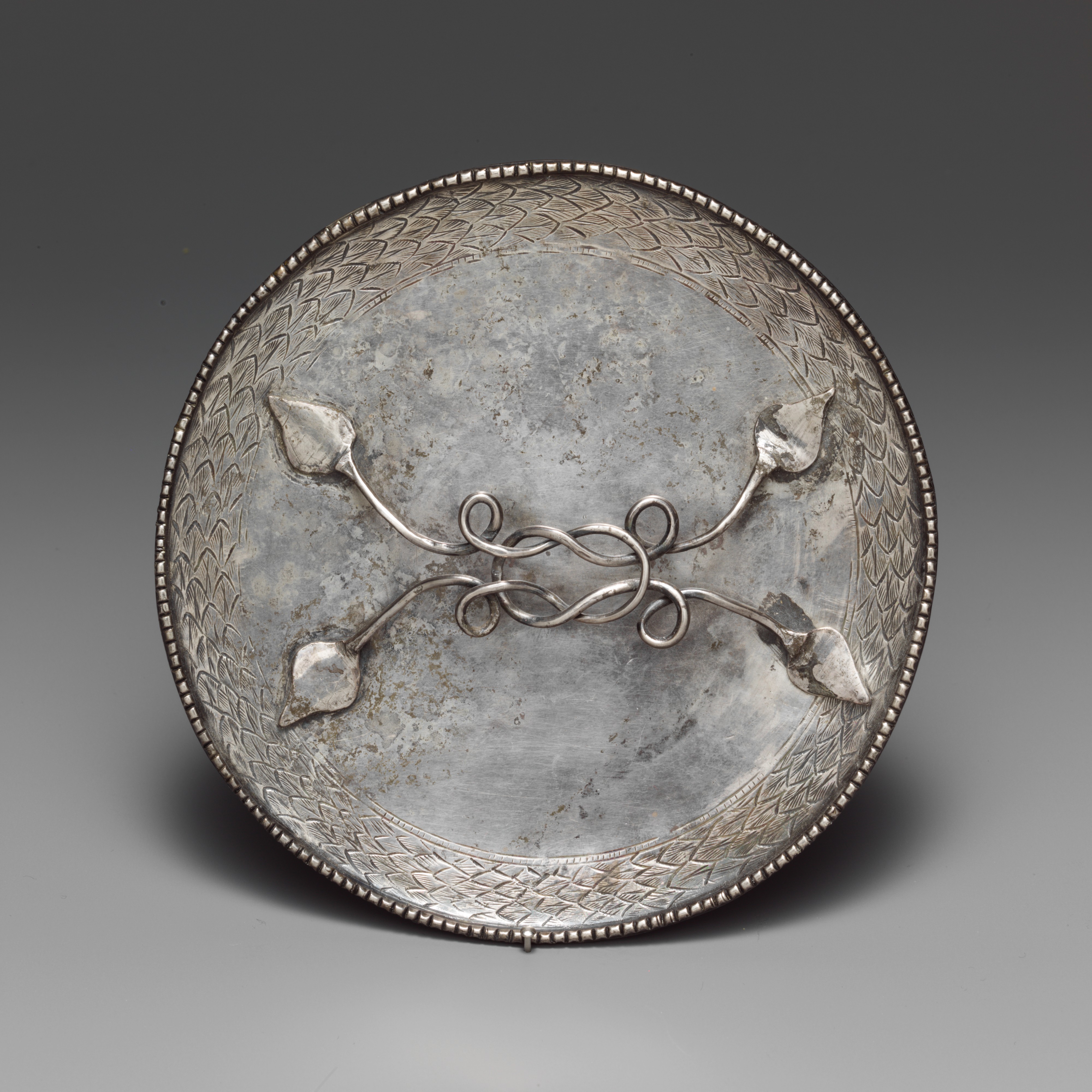 The type of mirror with a horizontal handle originated in the Roman world during the first century B.C. It was subsequently adopted in various cultures of Asia and finally died out in the ninth to tenth century A.D. In this example, the classical origins are clear in the leaf-shaped attachments of the handle, the Herakles knot, and the wreath around the circumference of the disk.