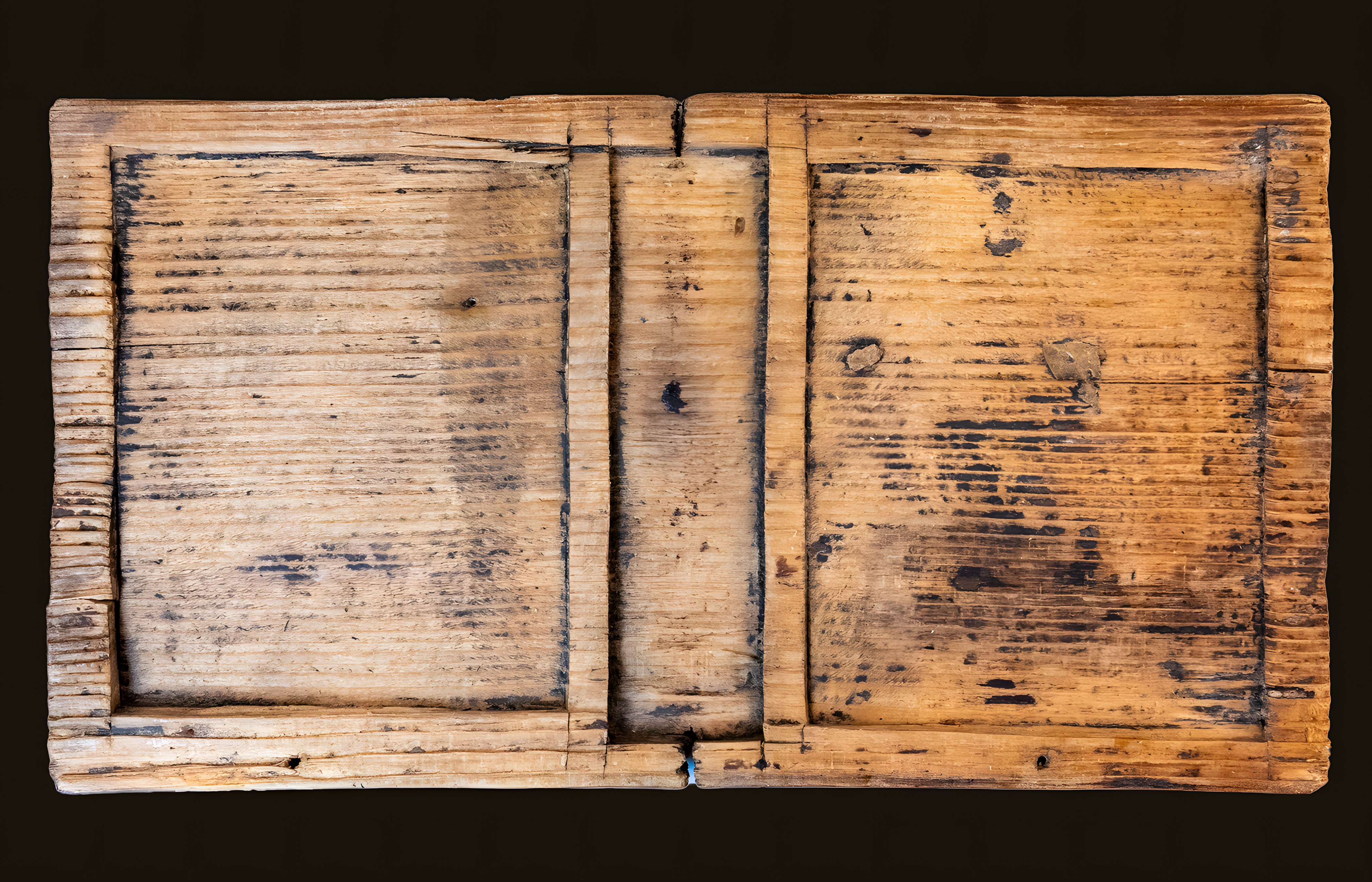 일반적으로 나무로 만들며, 납작한 판 위에 얕은 홈shallow recesses을 파서 왁스를 채운 형태다.
