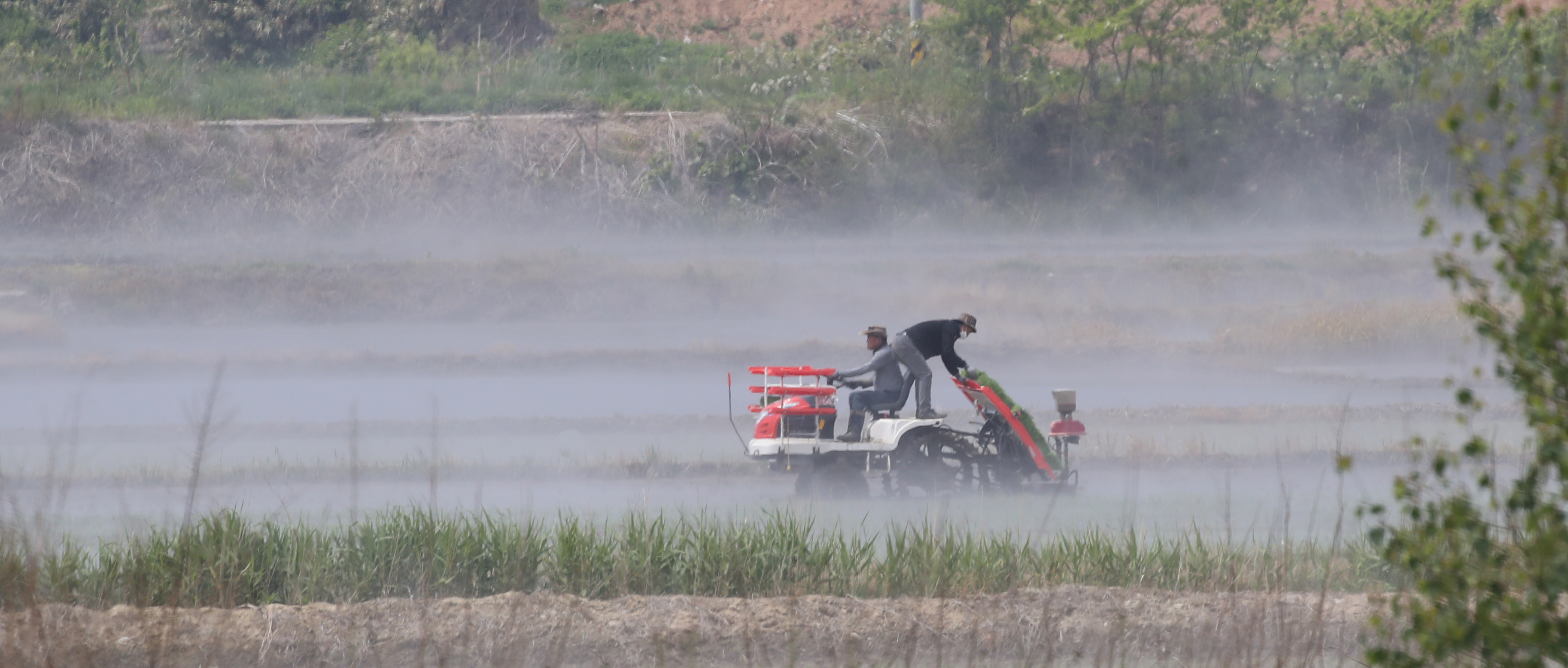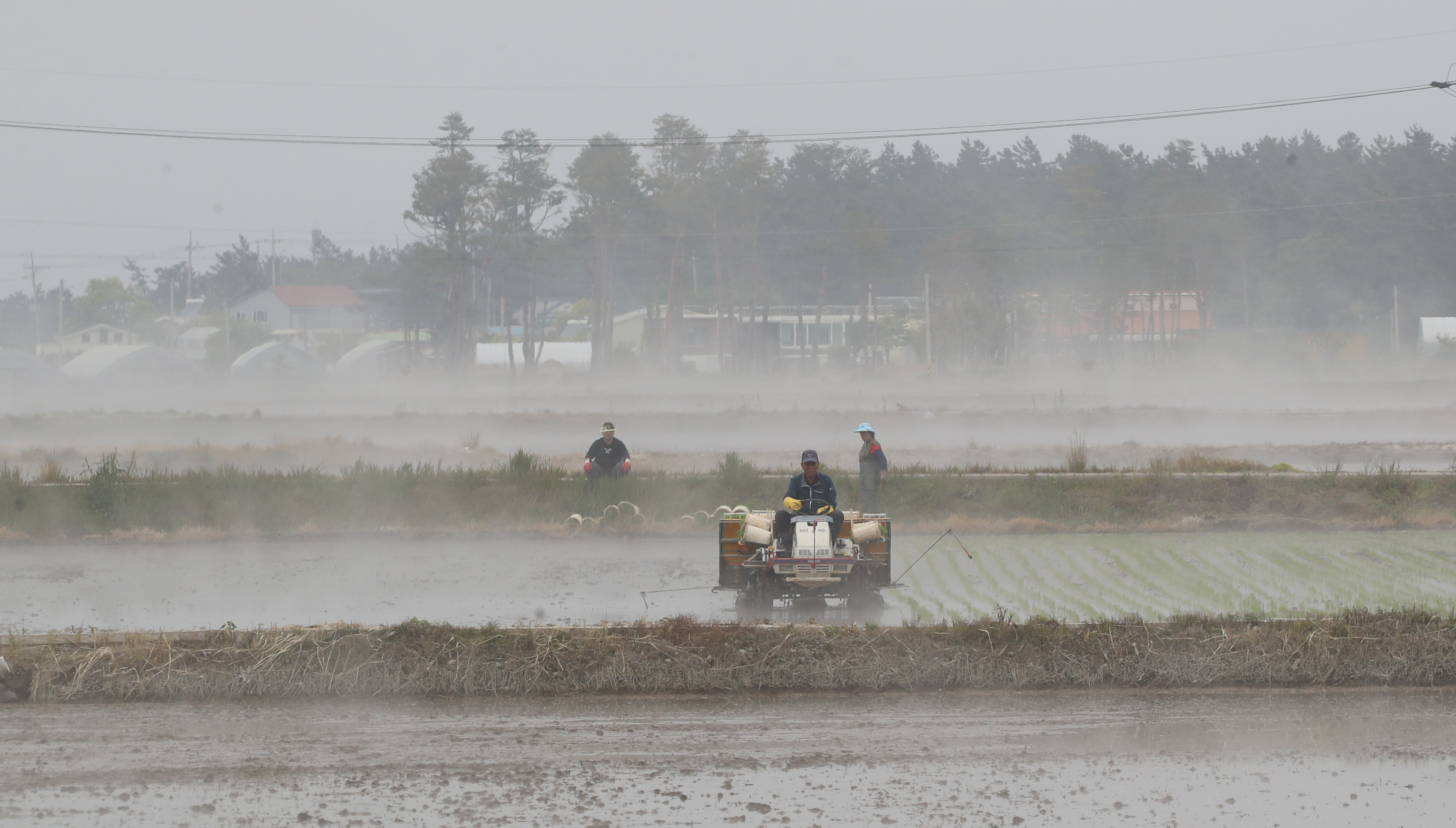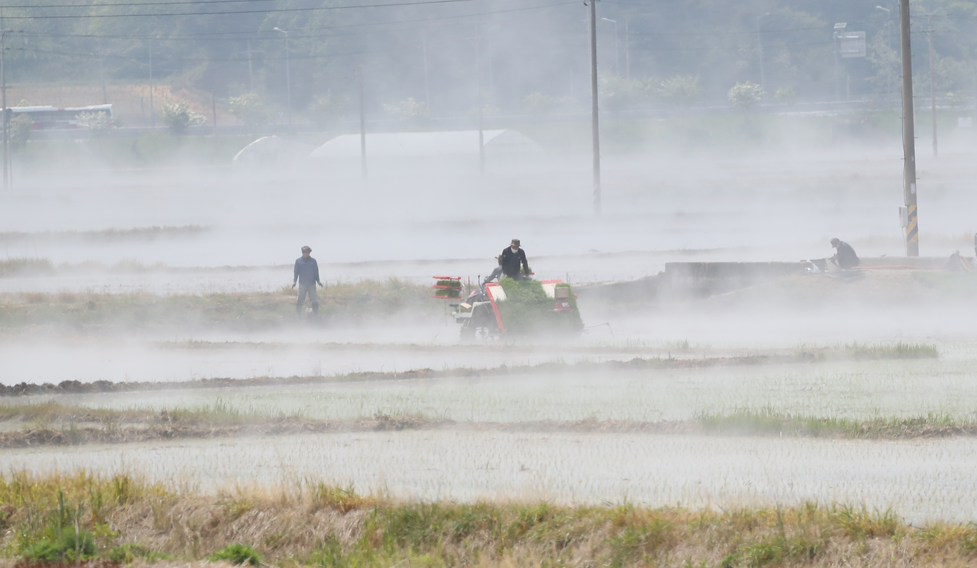 On the 13th, in the fields in Jumunjin, Gangneung-si, Gangwon-do, farmers are planting rice in a foggy paddy. (Yonhap)