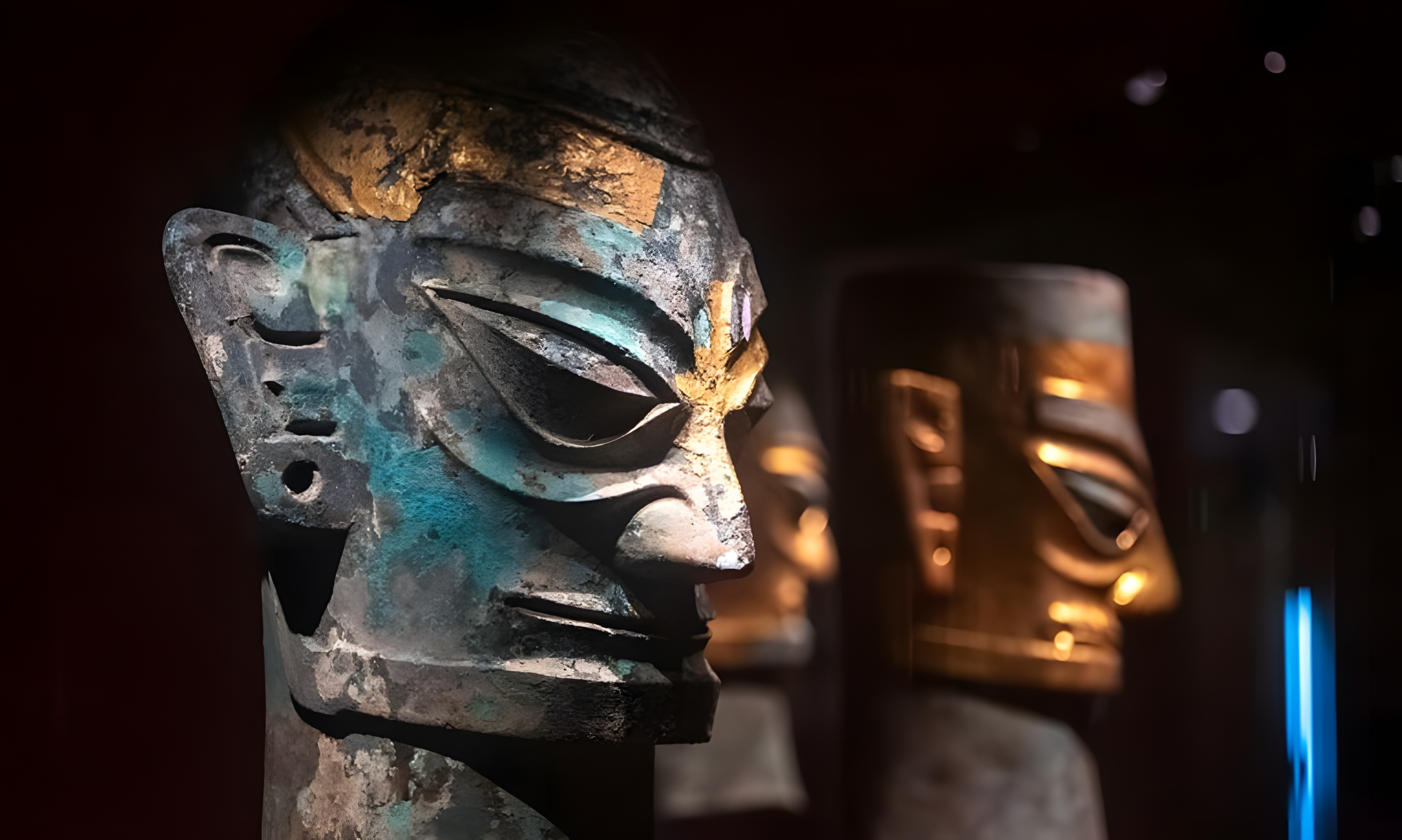 여기에는 눈이 튀어나온 실물 크기 청동 두상, 금박을 입힌 가면, 코끼리 상아, 정교하게 세공된 옥, 그리고 하늘과 땅을 연결하는 의식의 상징으로 여겨지는 정교한 청동 나무가 포함된다.
