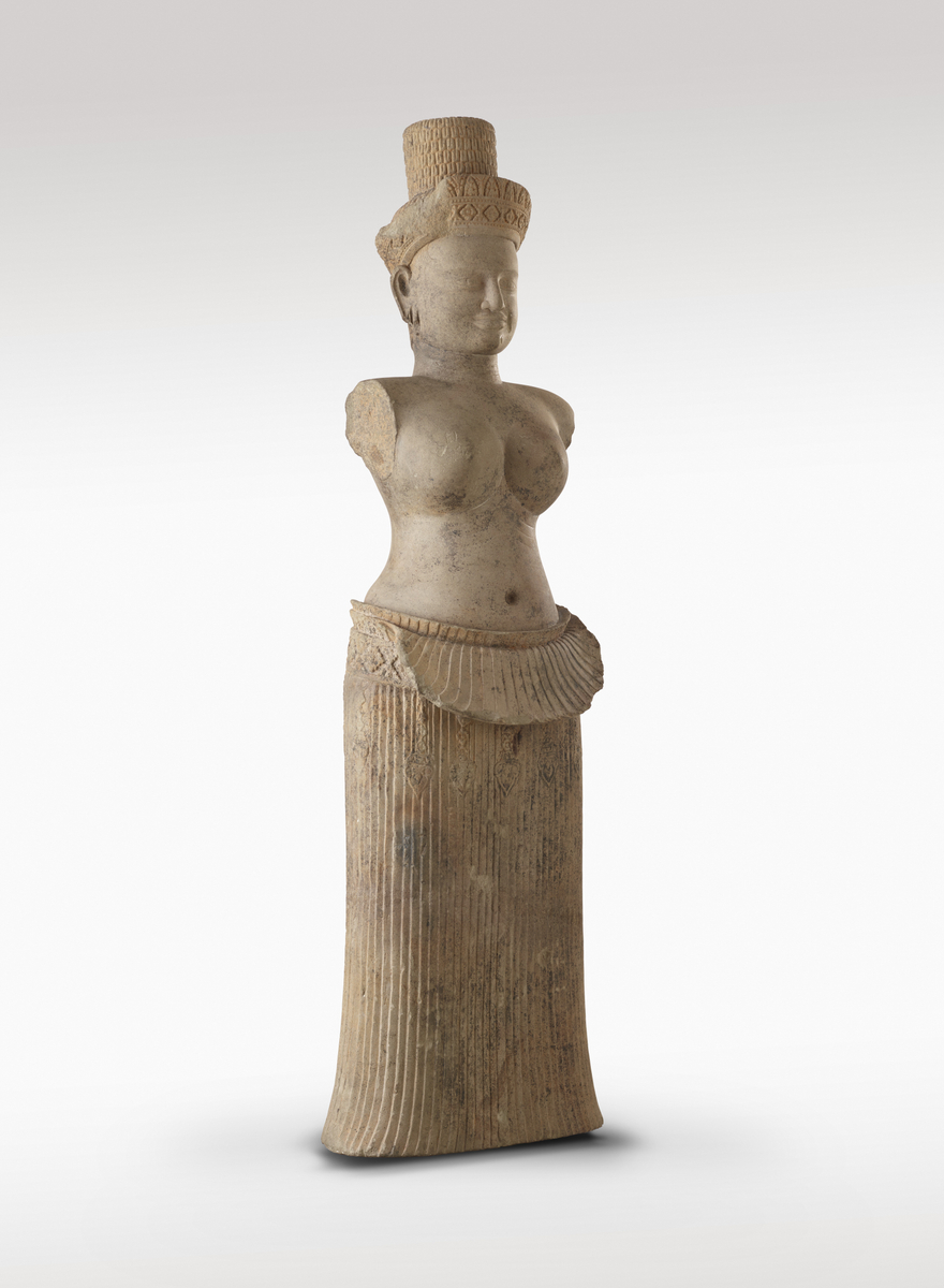 머리 장식과 허리띠에 새긴 정교한 꽃무늬는 언덕 위 사원인 프놈 바켕Phnom Bakheng 조각을 연상시키며, 프놈 바켕 부조와의 시각적 유사성은 이 조각상이 해당 사원과 밀접한 관련이 있음을 더욱 분명히 보여준다.