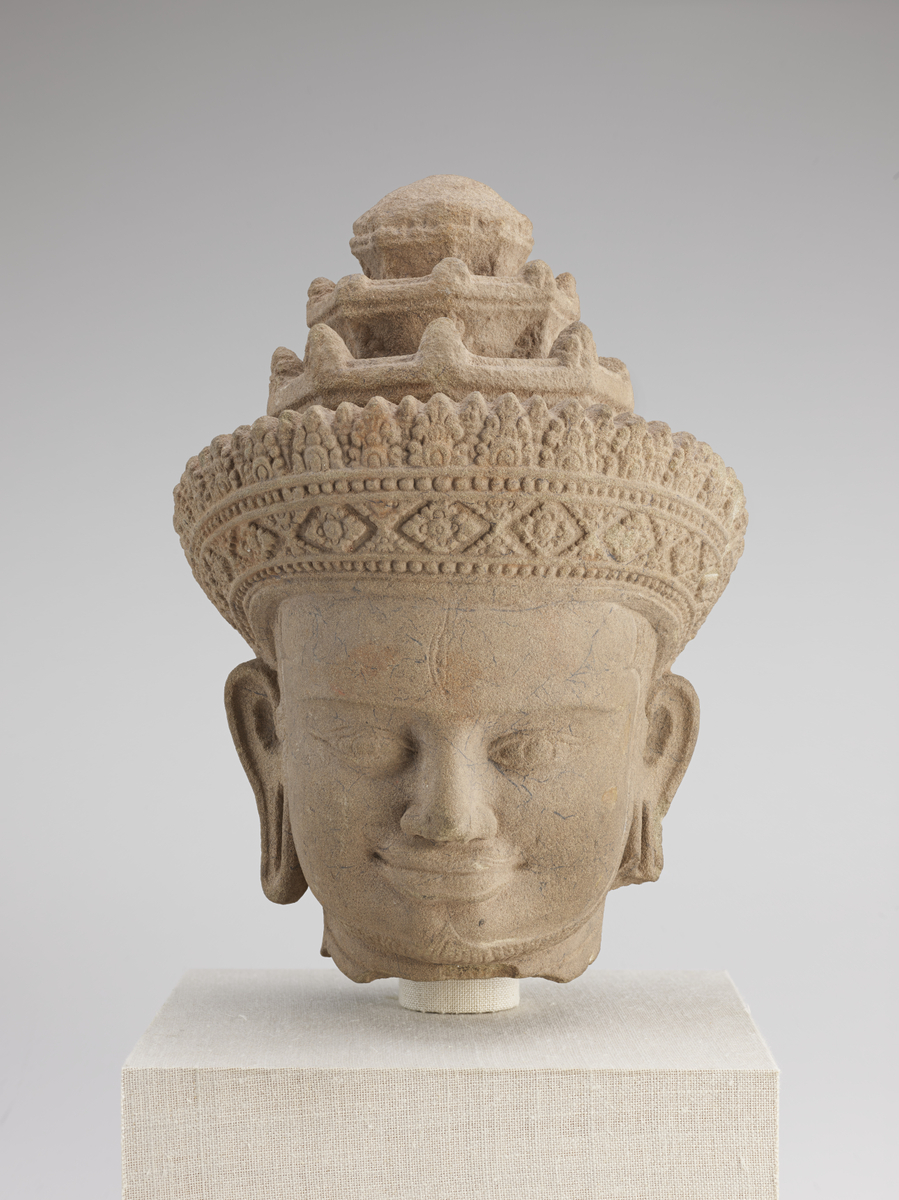“하리하라 두상”은 시바Shiva와 비슈누Vishnu를 결합한 복합 신상이다. 시바의 제3의 눈은 절반만 보여 이중적인 정체성을 확인하며, 프레룹 사원temple of Pre Rup에서 발견되는 것과 같은 꽃무늬로 조각된 정교한 3단 머리 장식three-tiered headdress은 우주의 신화적 중심인 메루산Mount Meru을 연상케 하는 캄보디아 사원 탑을 닮았다.