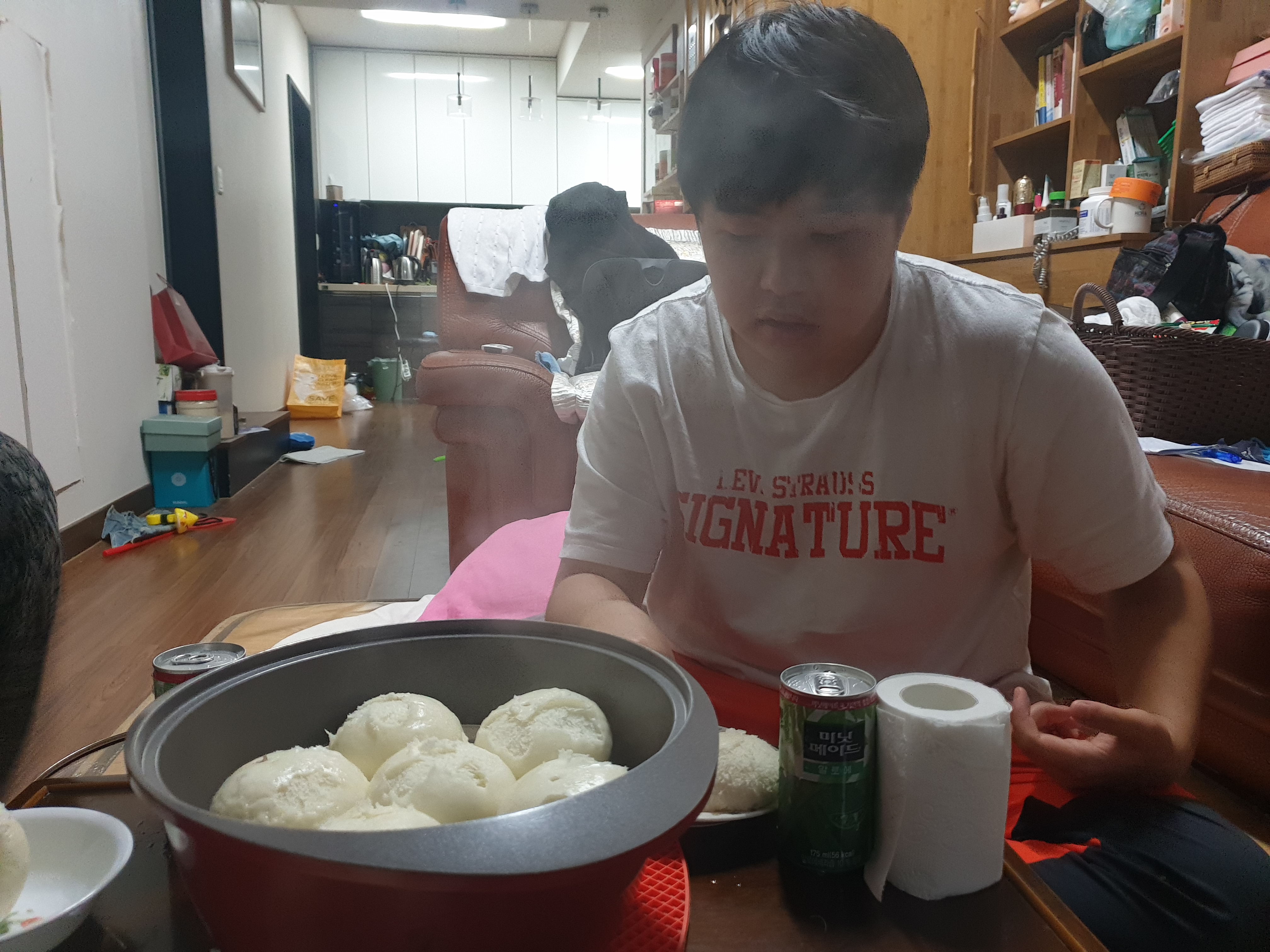 관건은 몇 개씩 먹을까인데 언제나 내가 아들놈보다 차지 하는 몫이 많으니 오늘 보건대 저 친구 버릇이 참말로 묘해서 저 찐빵 번질번질한 껍데기는 홀라당 벗겨 먼저 먹는지라 왜 그러는지 물었더니 대답이 걸작이라