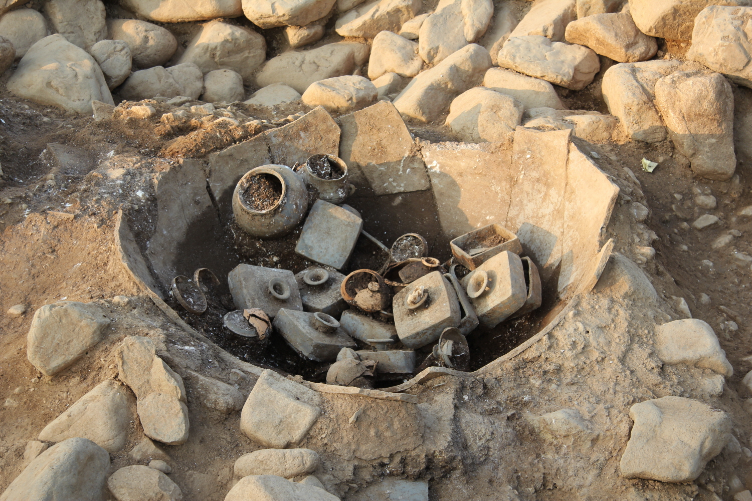 About 7,700 pieces of animal bone were found in a jar near the edge stones of the south grave, which is believed to have been used for ancestral rites.