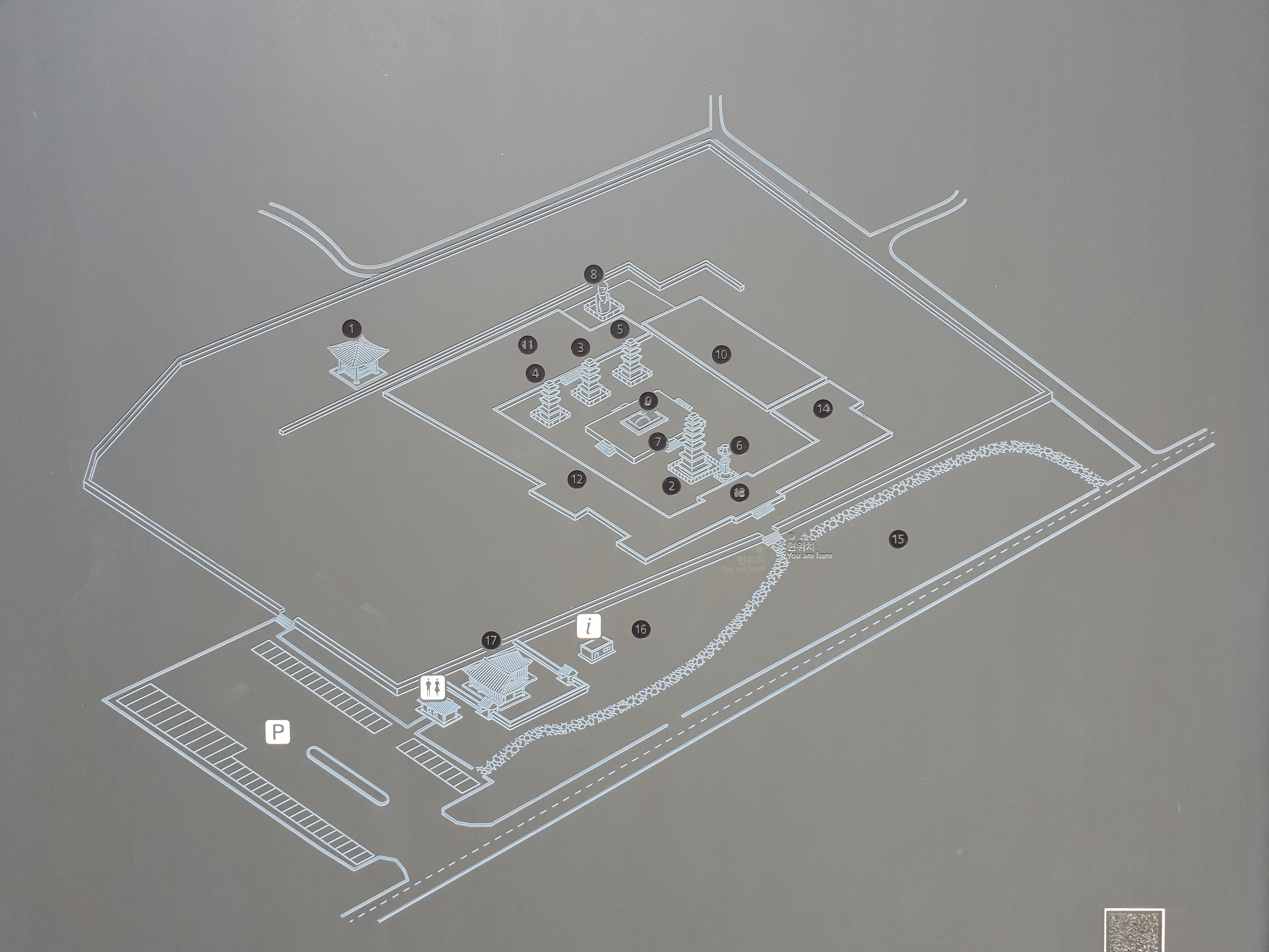 The East Three-story Stone Pagoda, Central Three-story Stone Pagoda (Treasure No. 20), and West Three-story Stone Pagoda (Treasure No. 47) are aligned side by side from east to west, with an auditorium at their rear side.