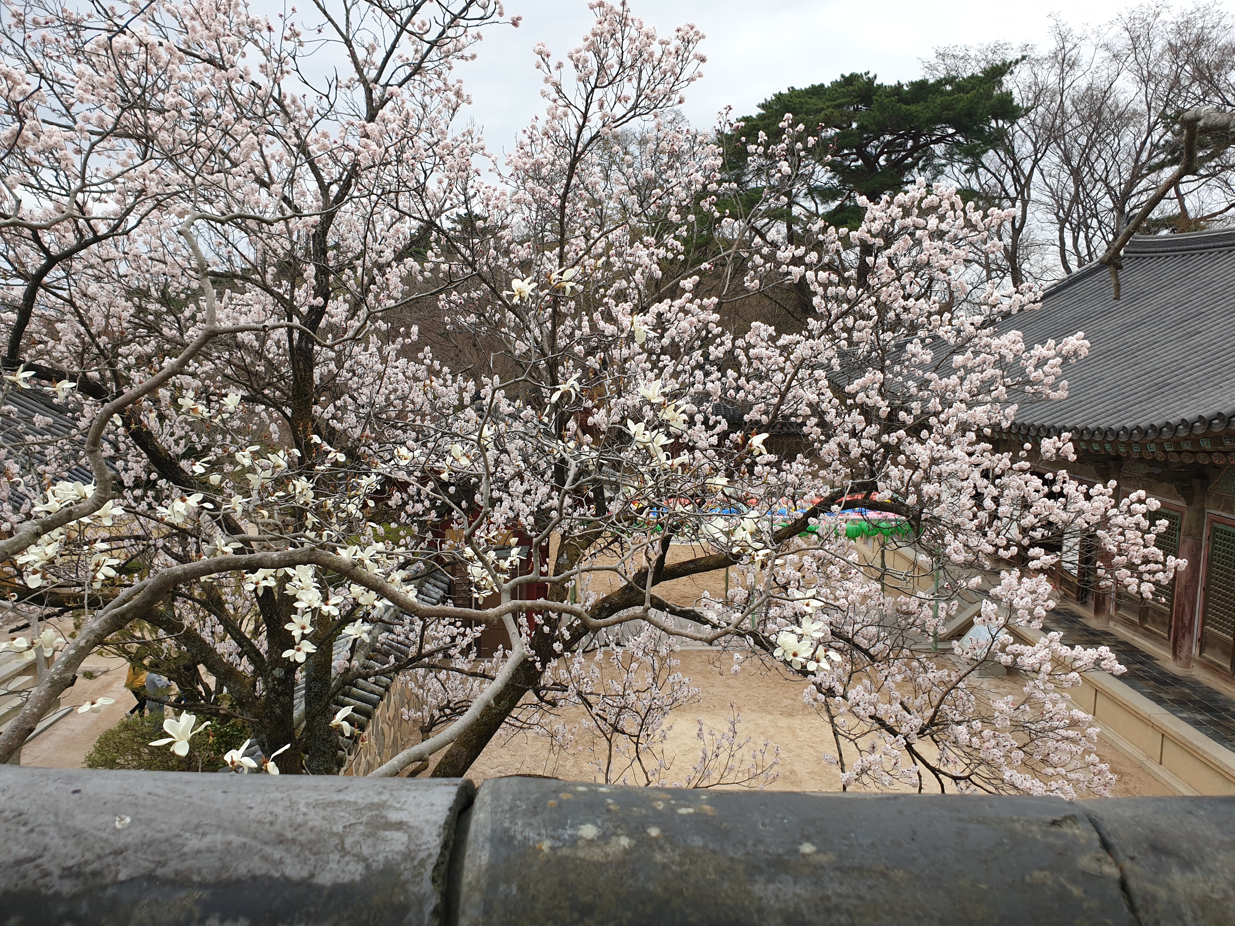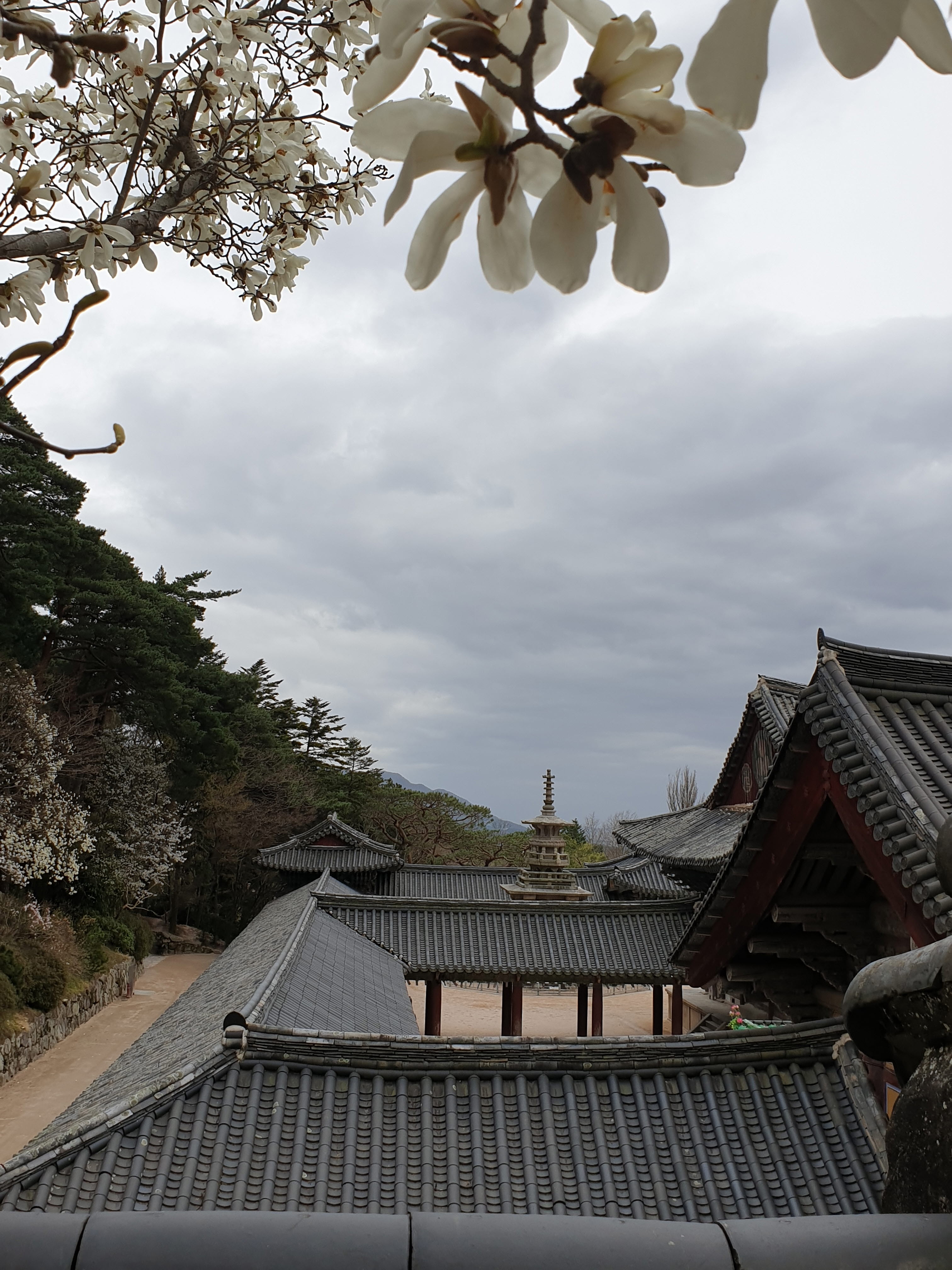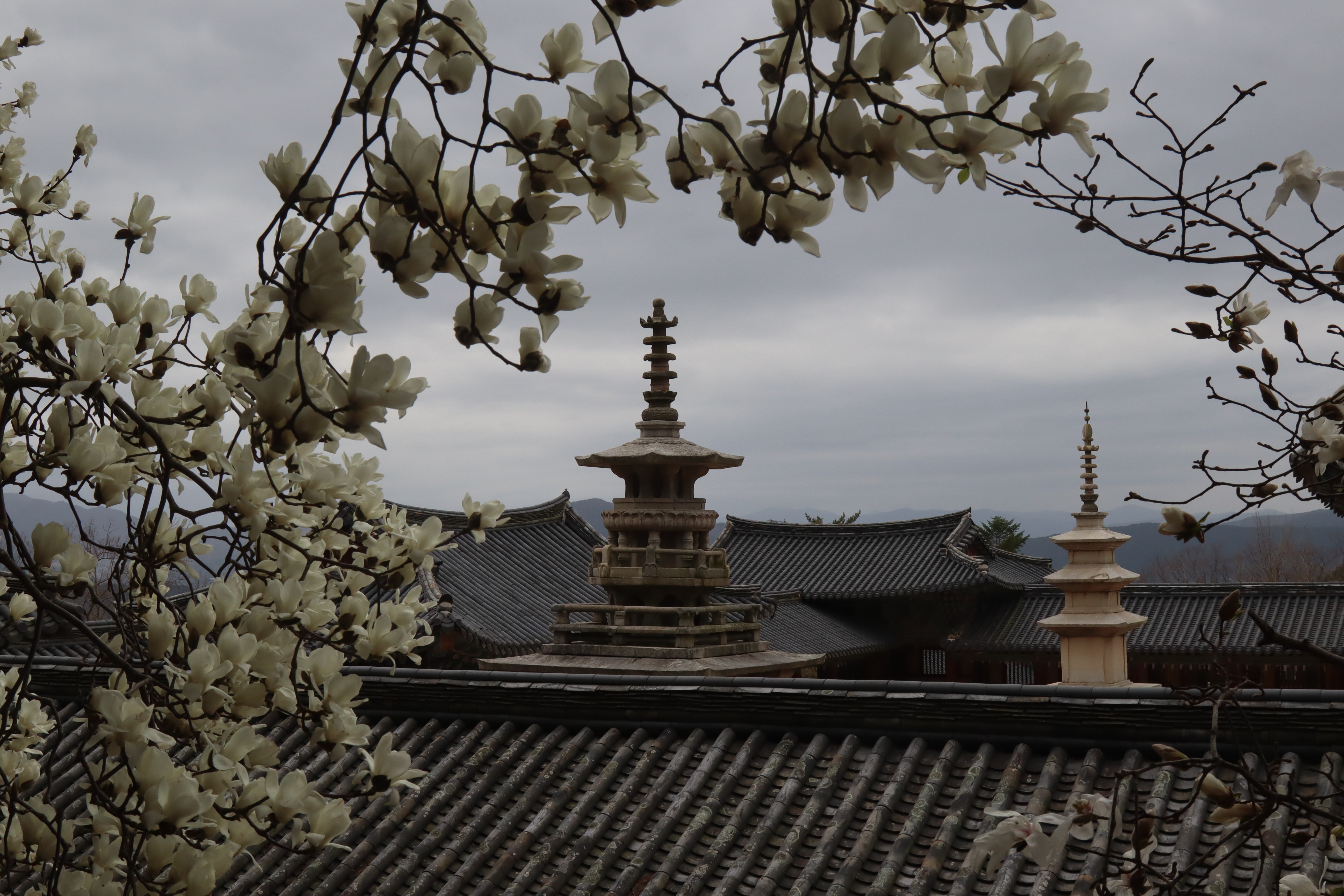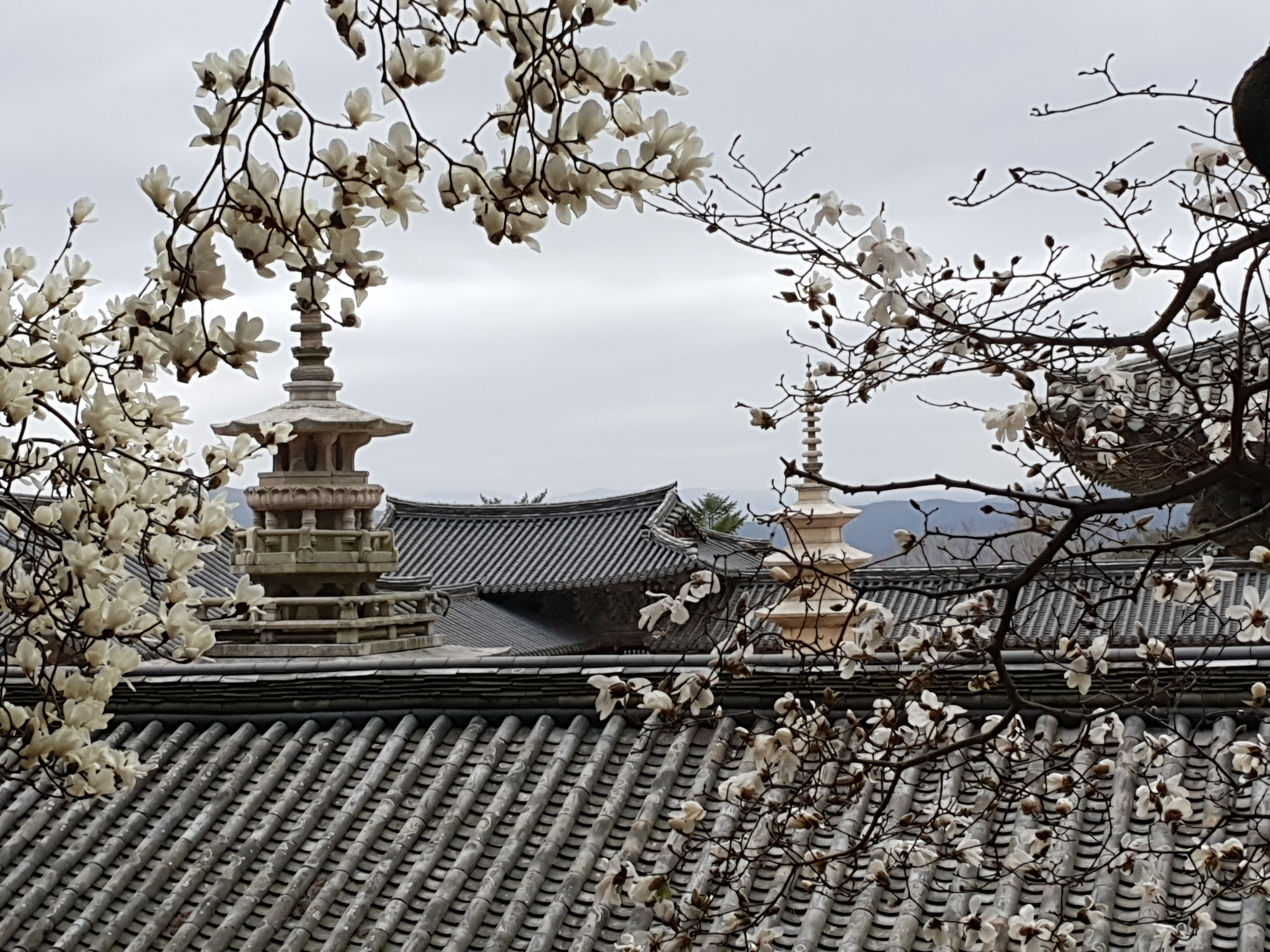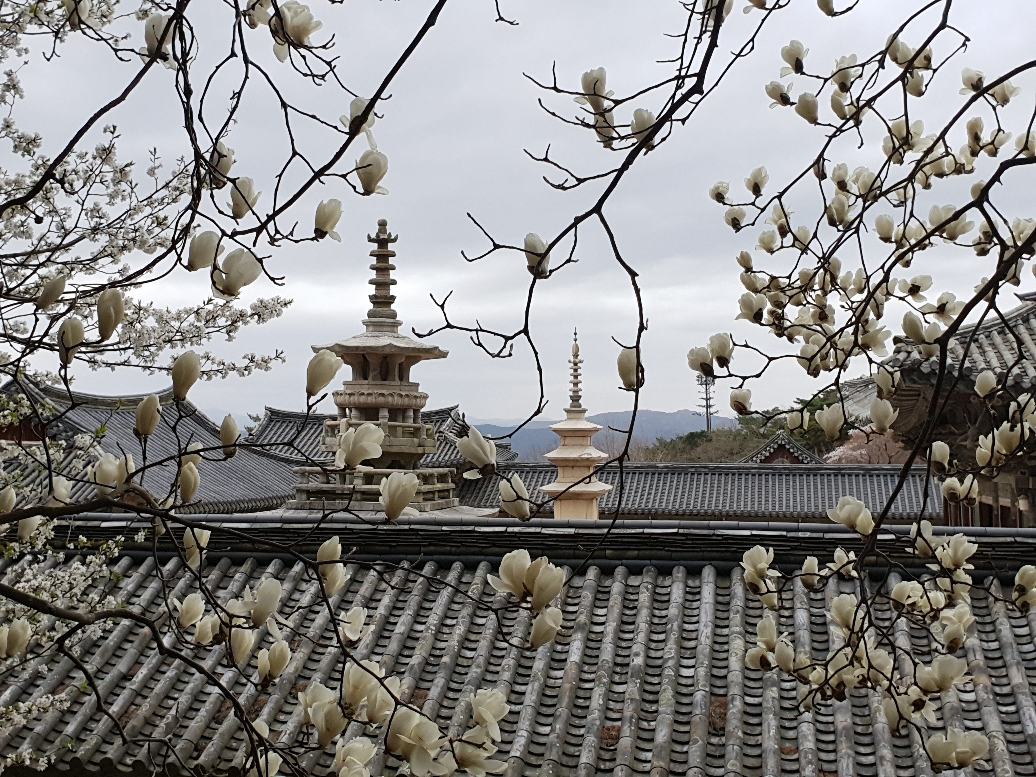호총 같은 목련 이불 틈바구니로 다보 석가 두 탑 오토가니 목을 내미는데