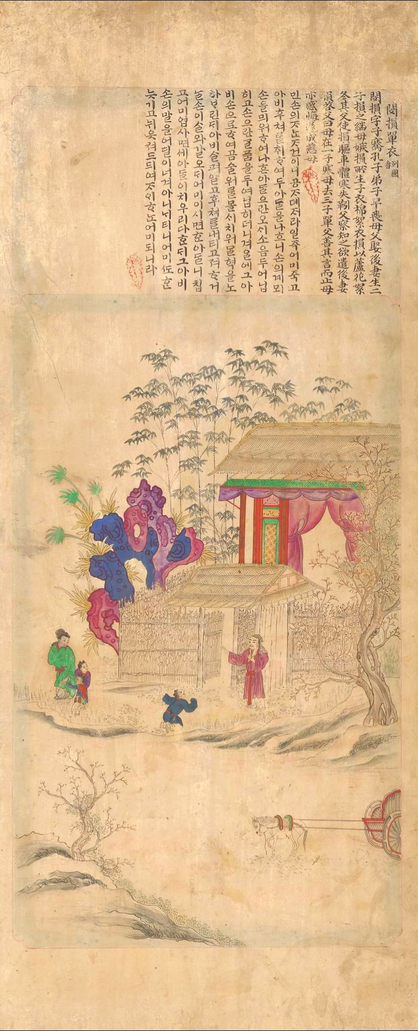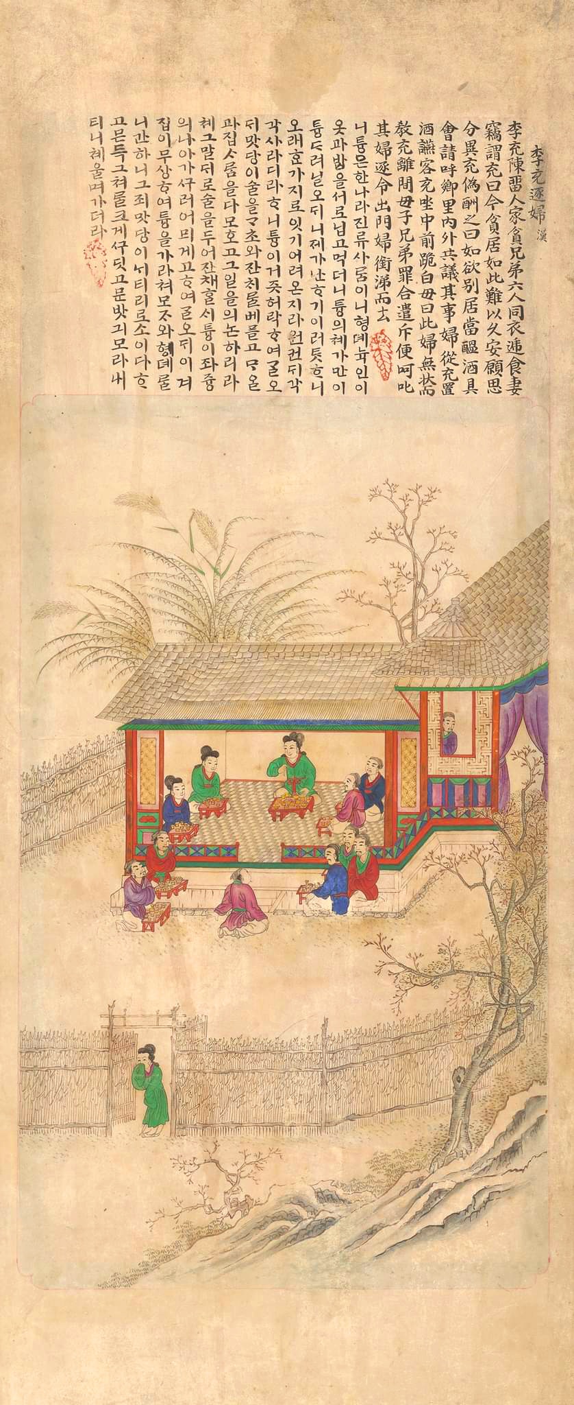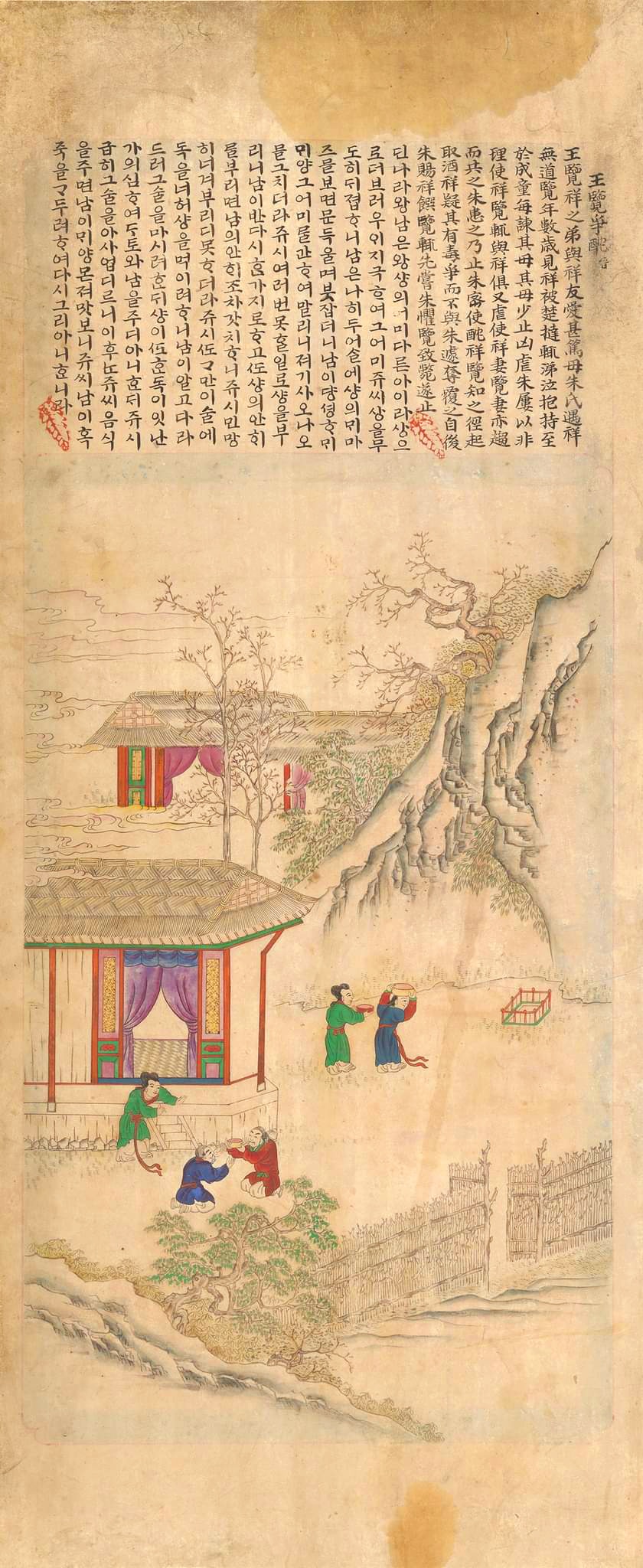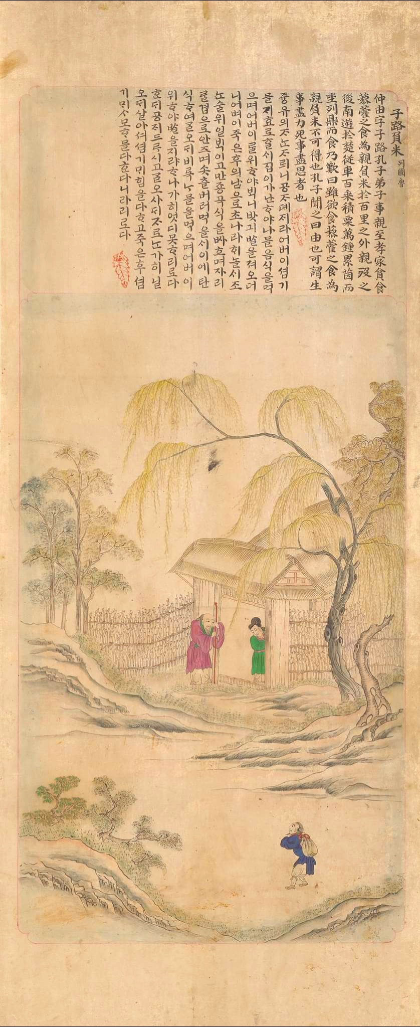 The attached writings and paintings all convey tales about good sons and brotherly affection which appeared in the Paintings of Five Moral Imperatives (Oryun Haengsildo).