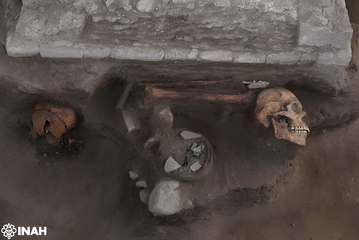 하단부 세 면에서 두개골 네 개와 긴 뼈(대퇴골femurs로 추정)를 포함한 인골 제물이 발견되었다.