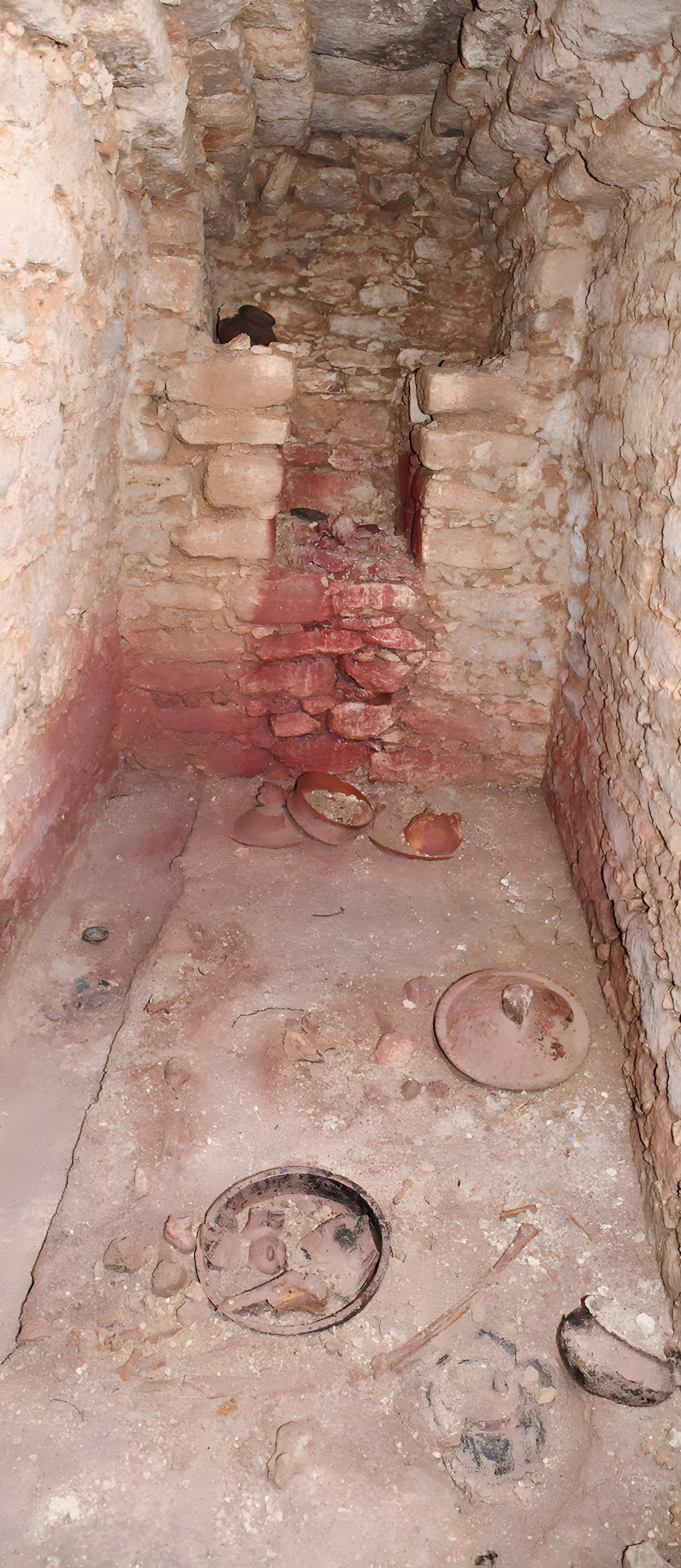 팀원들이 그 빈 공간에 들어갔을 때, 그들은 벽면이 붉은 주사red cinnabar로 덮인 높이 2미터 직사각형 무덤방rectangular burial chamber을 발견했다.