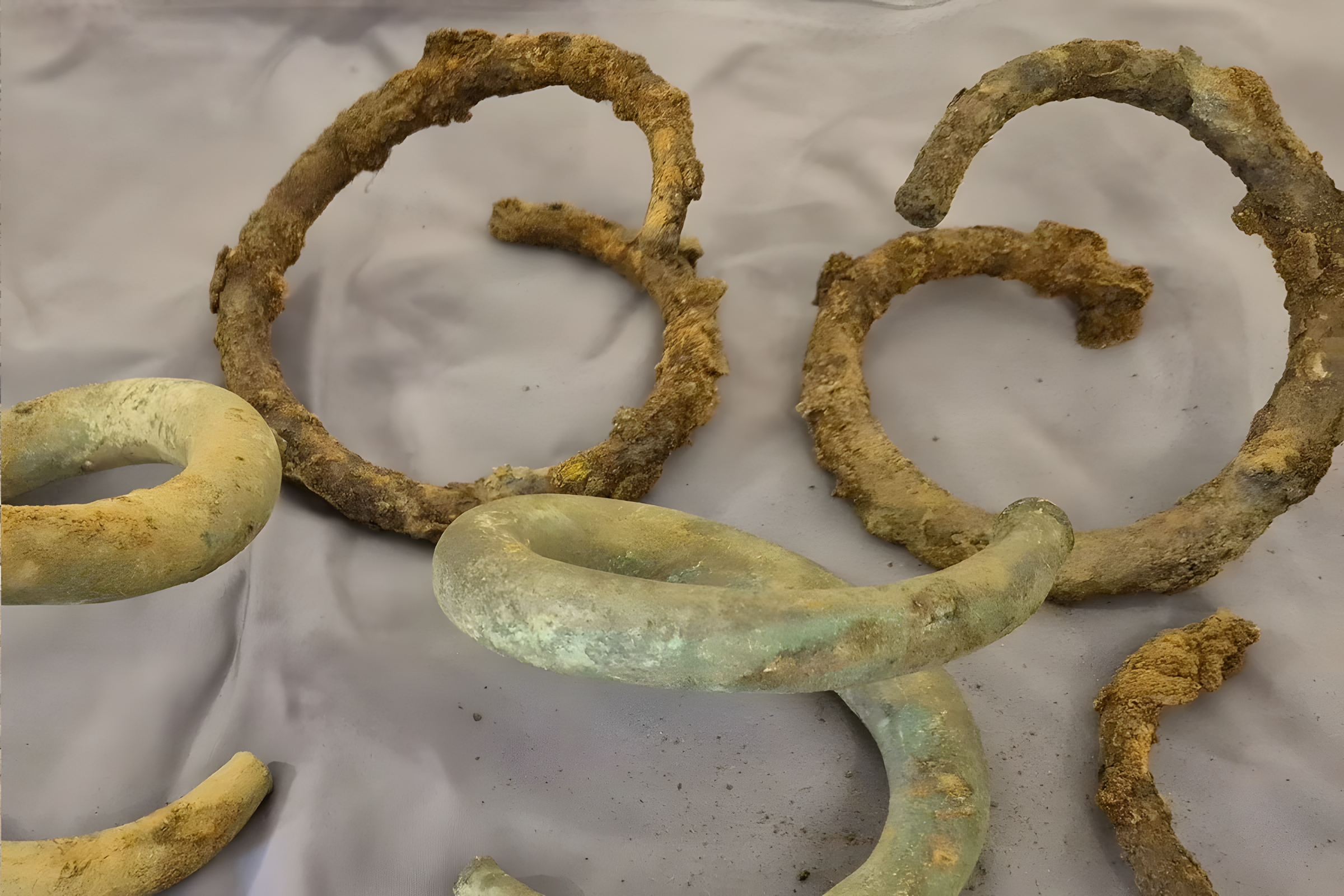 팀은 나선형 팔찌spiral armlets 여러 개, 청동과 철로 만든 정강이 보호대greaves 조각, 칼, 그리고 팔찌를 발굴했다.