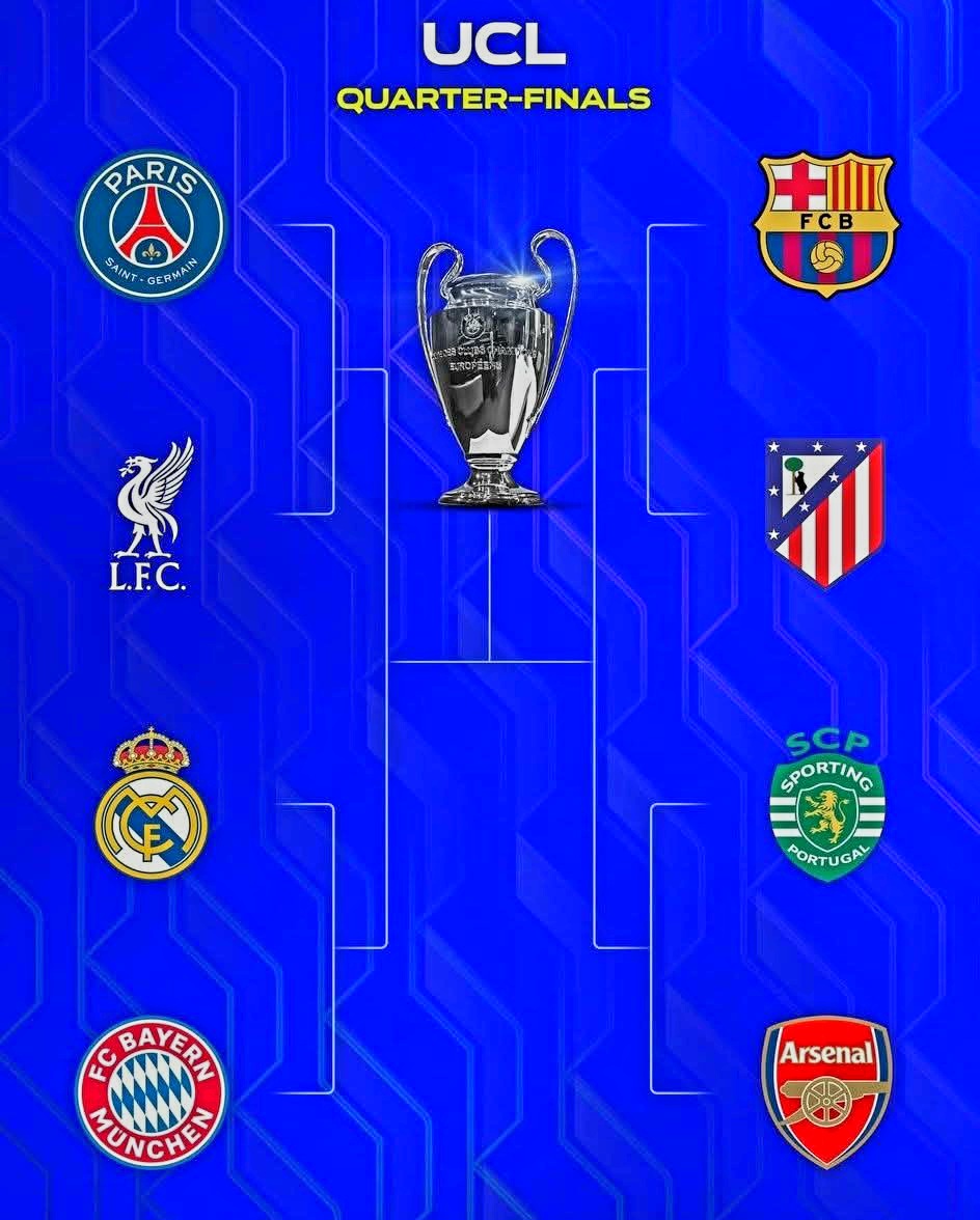 그 대진표를 보면 psg-리버풀, 레알 마드리드-바이에른 뮌헨이 한 쪽을 형성하며, 다른 쪽에서는 바르셀로나-아틀레티코 마드리드, 스포르팅 CP-아스널 대진표가 완성됐다.