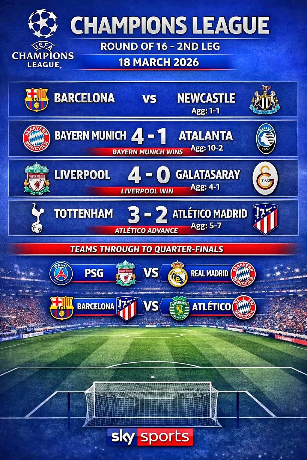 25-26시즌 유에파 챔피언스리그 16강 녹아웃 스테이지 2라운드가 조금 전 종료하면서 8강 진출팀이 가려졌으니