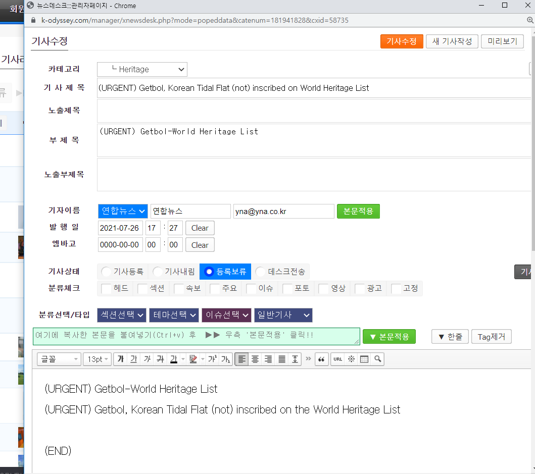 보통 이런 시급성을 다투는 소식은 우리 공장 영어뉴스부가 따로 있어 당연히 관련 기사가 넘어오지만, 아무래도 그쪽은 늦을 듯해서 내가 한류기획단 자체로 준비했으니