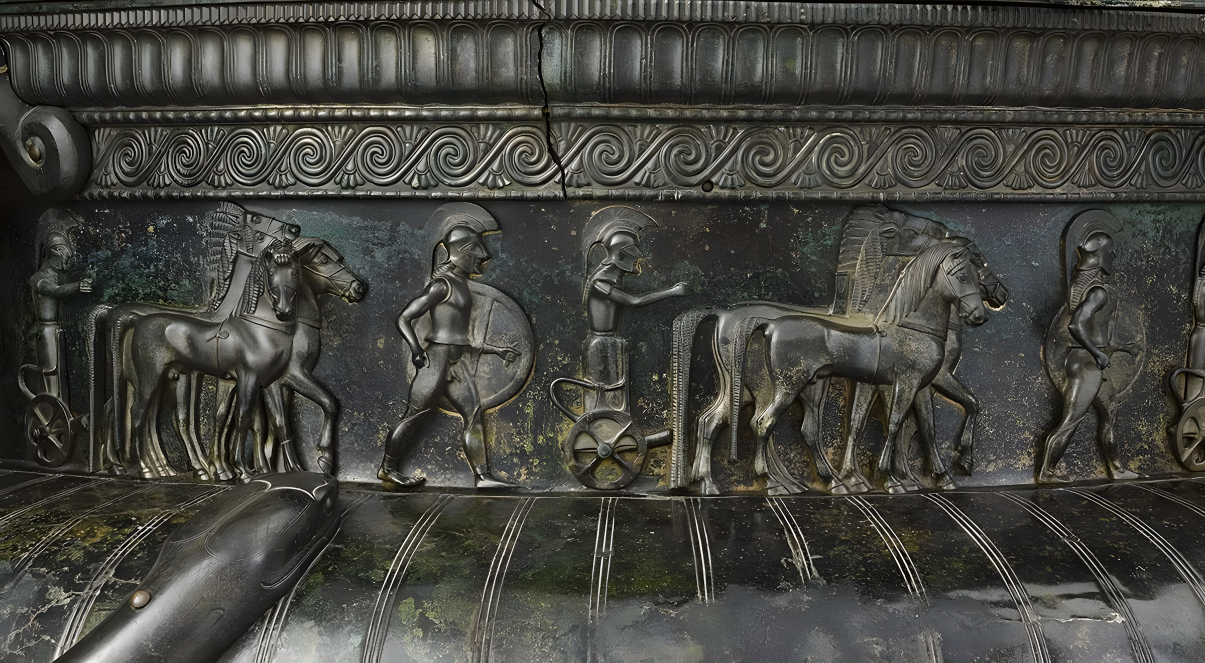 중장보병 프리즈는 병 몸통에 삽입되어 손잡이를 지지하는 청동 고리로 만든 용기 목 부분을 장식한다.