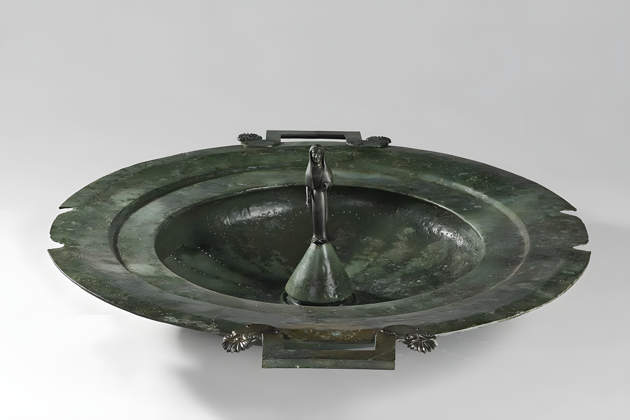 뚜껑 중앙 돌출부는 19cm 크기 청동 주형 조각상을 받치는데, 이 조각상에는 한 팔을 뻗은 여성이 묘사되는데, 한때 플라스틴크스plastinx와 같은 물건을 쥐고 있었을 가능성이 있다.