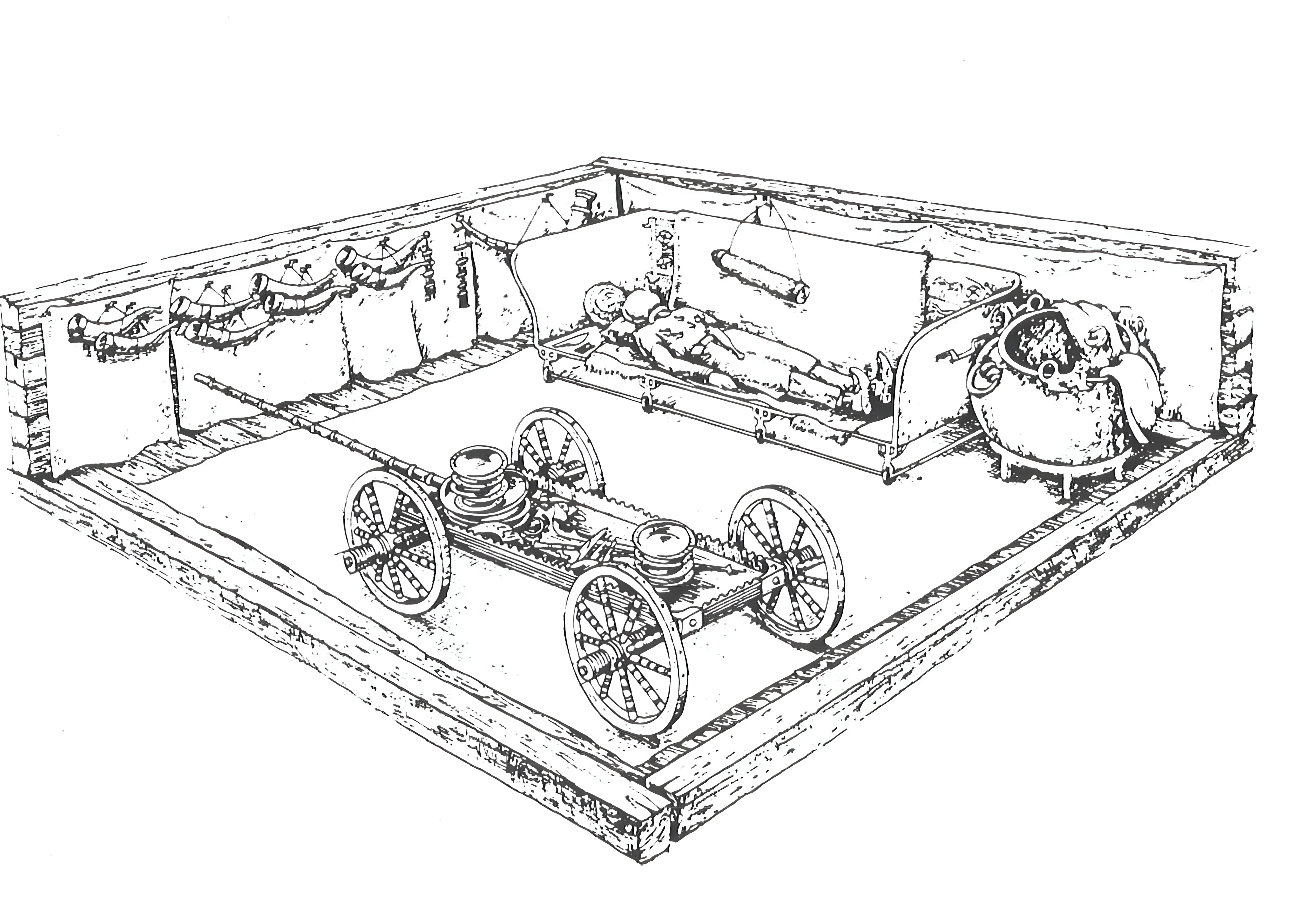 그녀의 시신은 바퀴가 분리되어 옆에 놓인 수레 또는 전차의 독립된 상자에 안치되었다. [이 전차 곧 수레가 시신을 옮긴 상여다. 계속 말하지만 무덤 속 탈것은 덮어놓고 상여로 간주해야 답이 풀린다.]