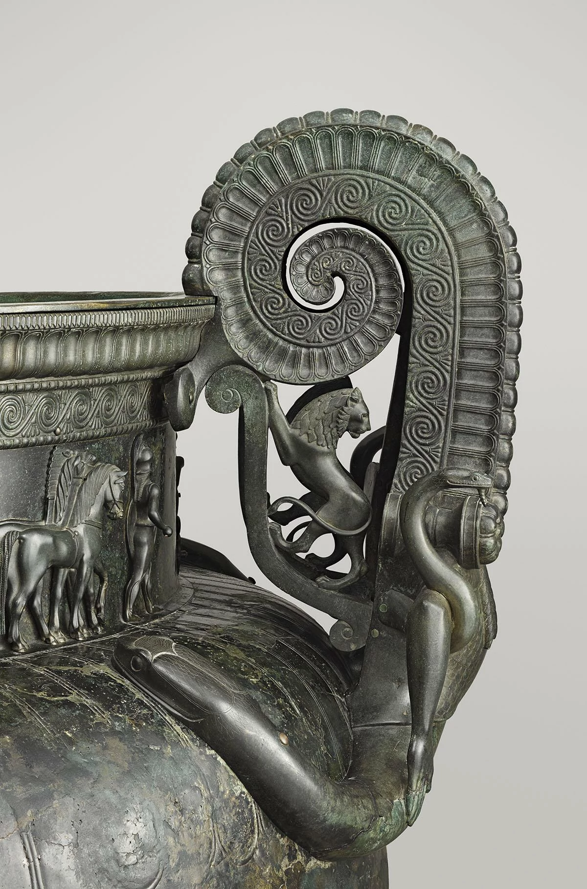 각 손잡이는 높이 55cm 볼류트volute 형태이며, 현대 그리스 청동기에서 흔히 볼 수 있는 찡그린 얼굴의 고르곤gorgon으로 정교하게 장식헸다.