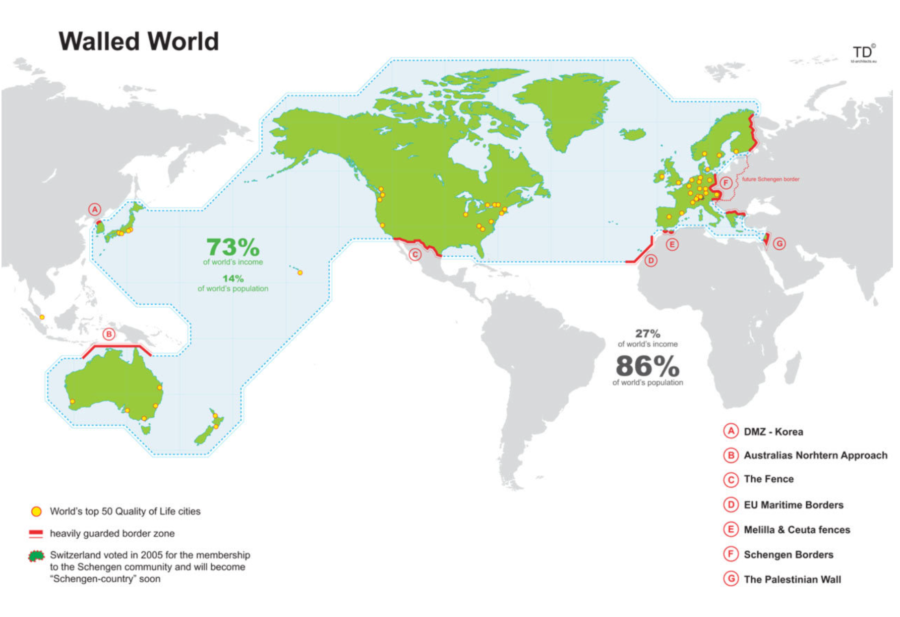 외국인에게는 미국과 멕시코 사이의 장벽, EU와 비 EU의 경계, 동남아시아와 호주사이의 국경, 이스라엘과 팔레스타인 사이의 경계벽과 같은 의미를 갖고 있다는 의미이다.