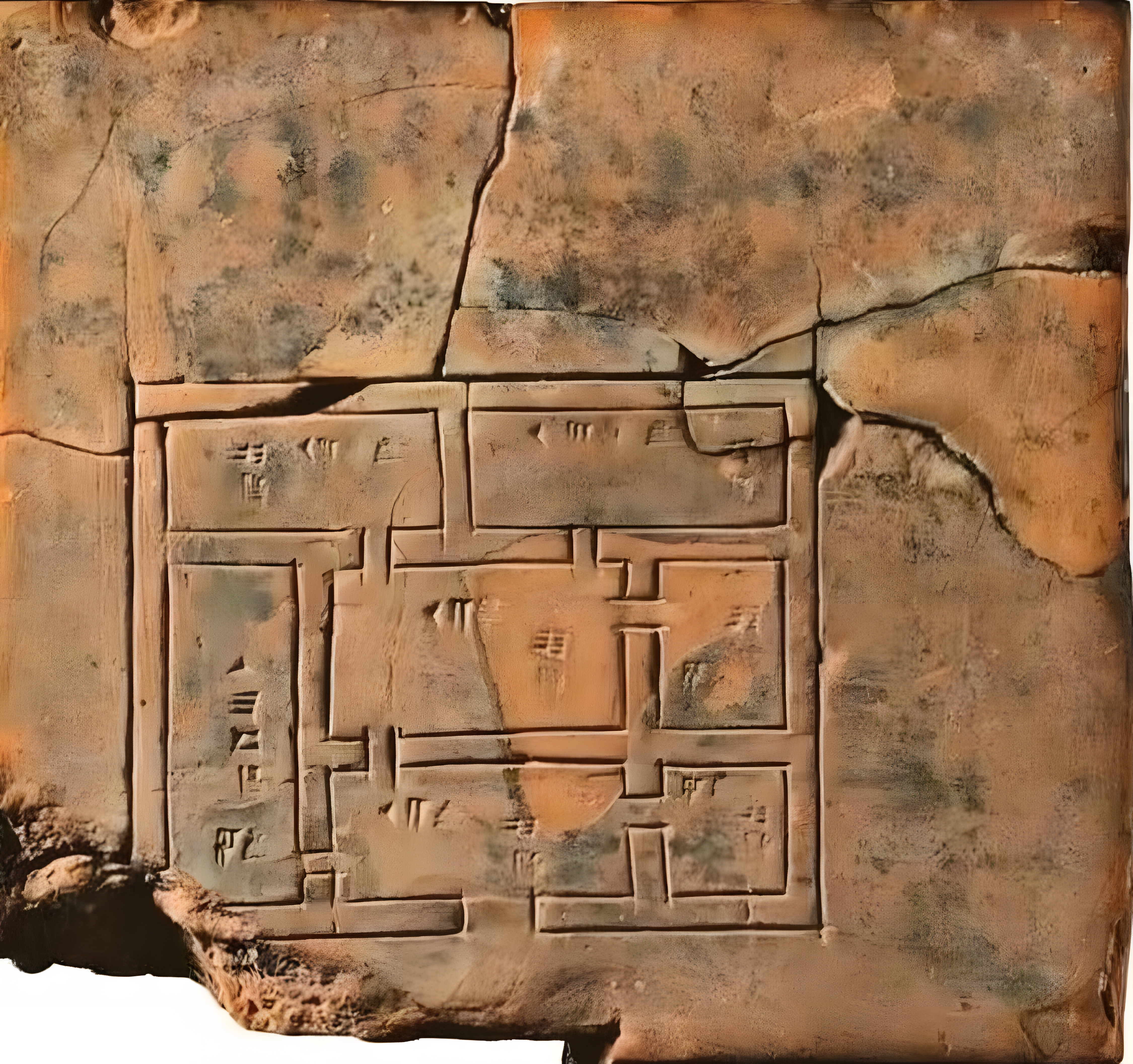 현재 독일 베를린 소재 근동박물관[Vorderasiatches Museum]에 보관되어 있는 움마Umma[엄마?] 출토 이 점토판은 중앙 안뜰이 특징인 거주지 상세한 윤곽을 보여준다.