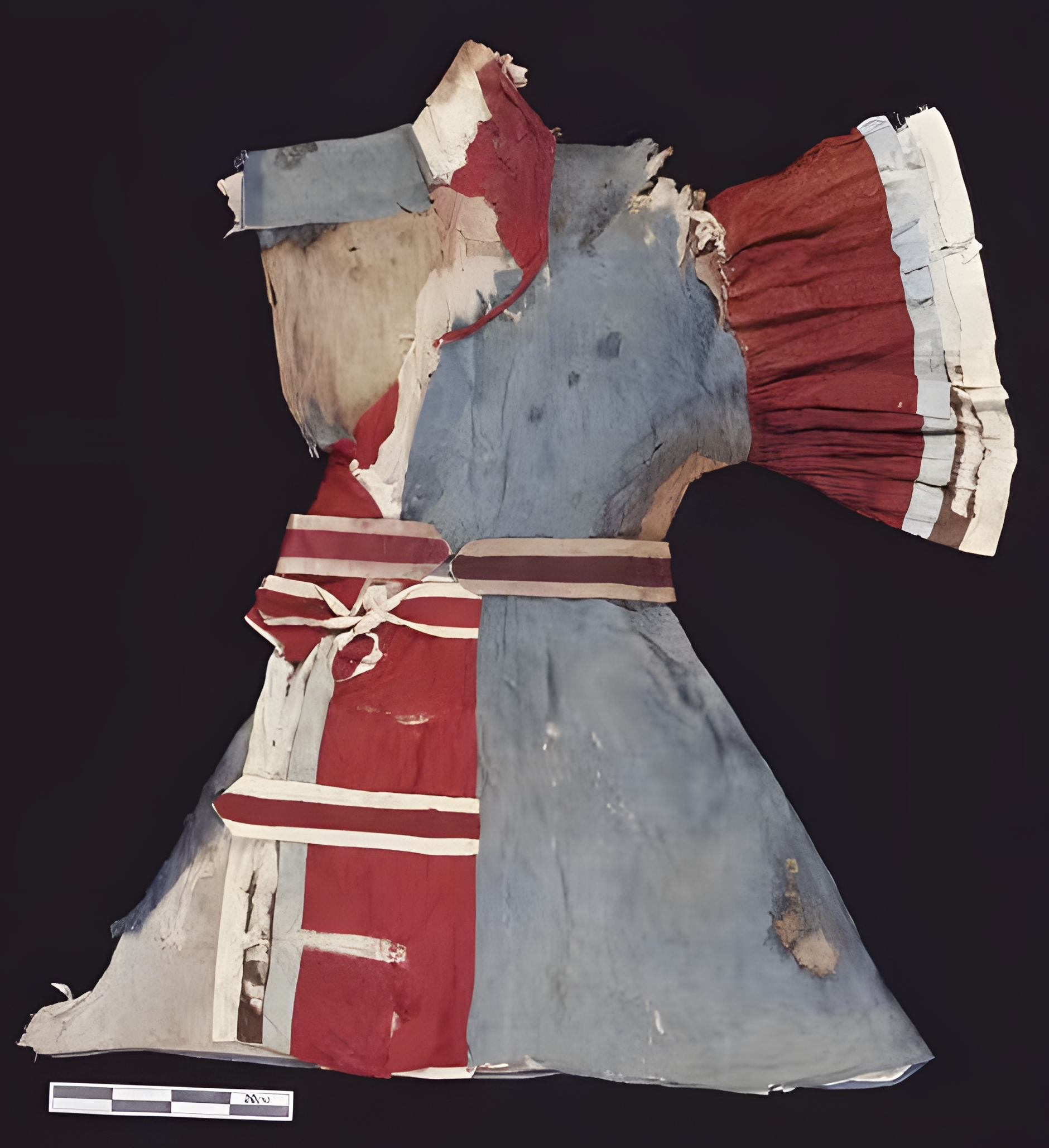 정교한 트럼펫 소매trumpet sleeves가 달린 이 실크 가운silk robe은 서기 1세기 신장위구르 지역 패션의 전형적인 예로 평가된다.