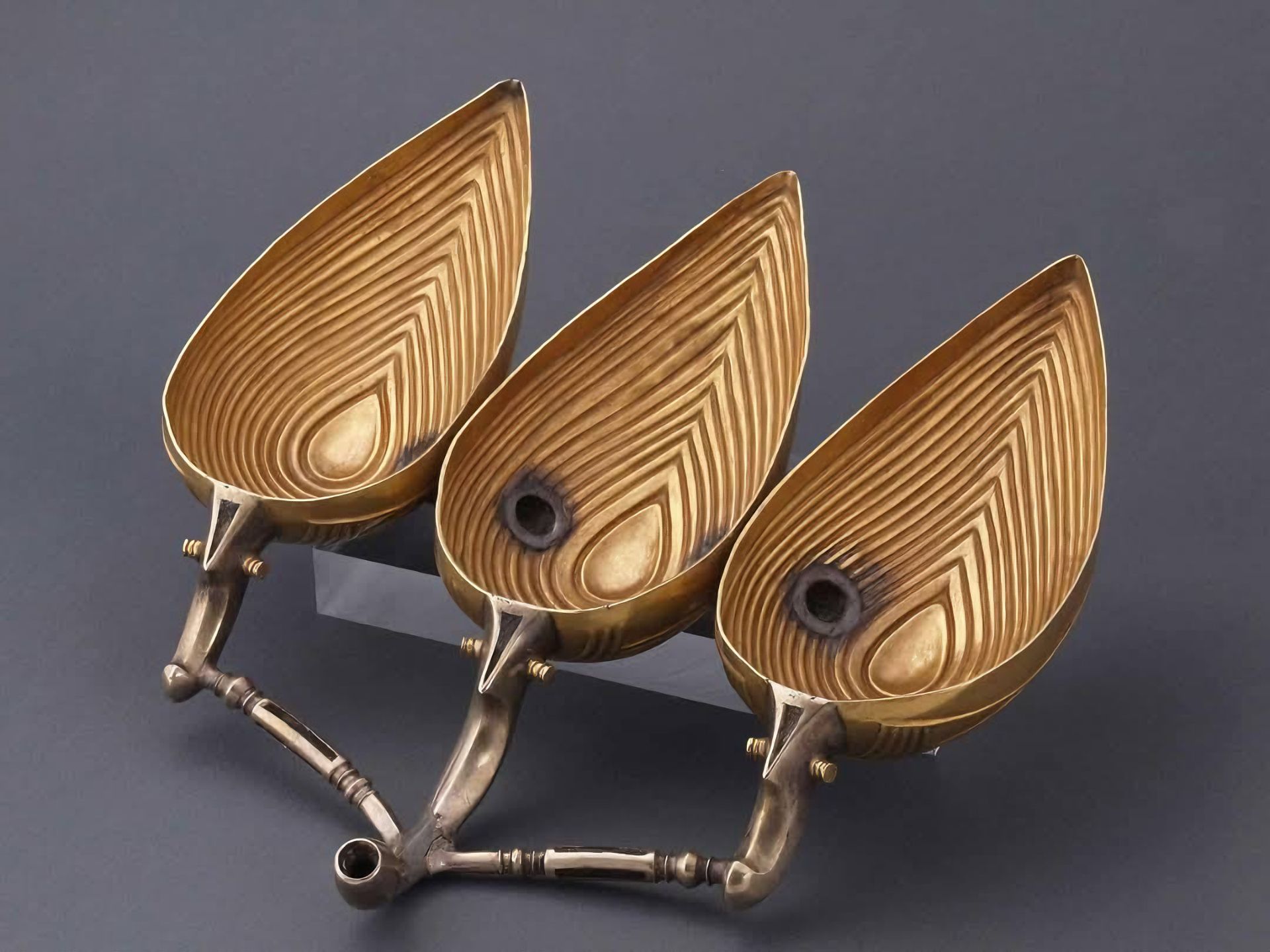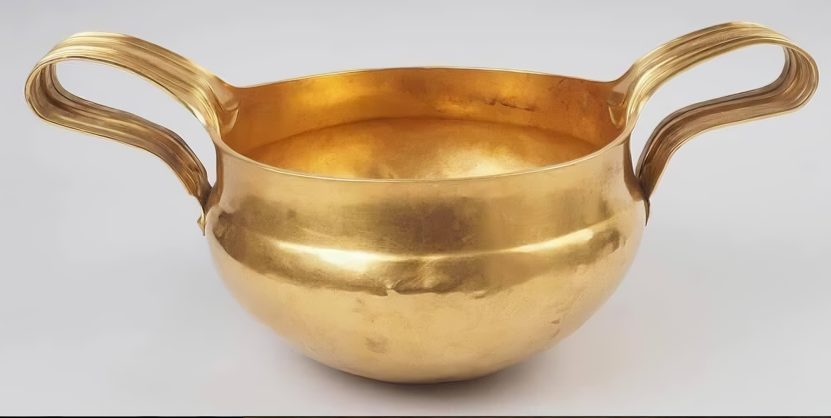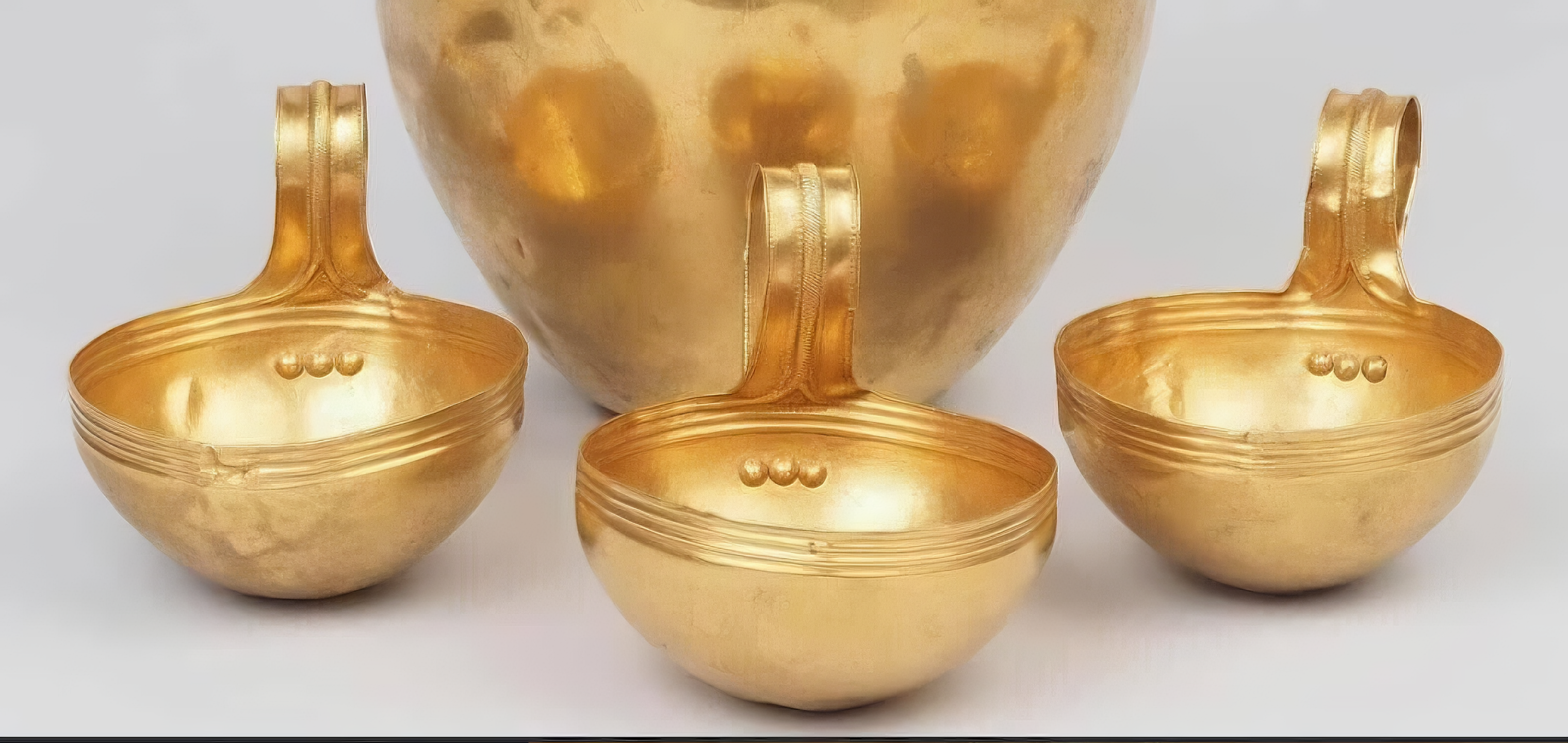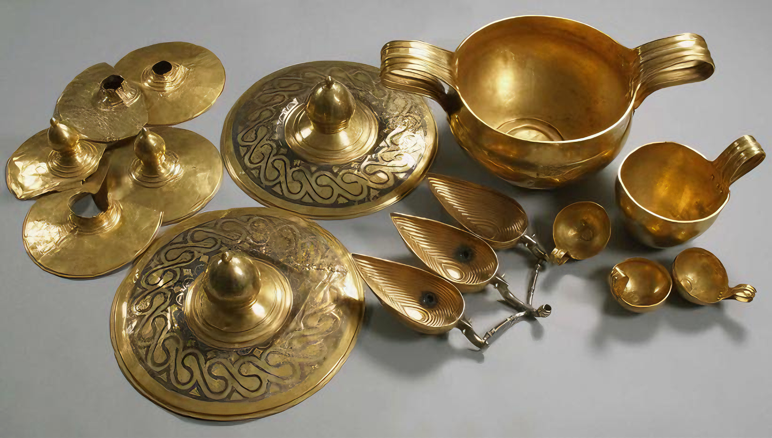 The treasure was found by chance in 1924 and weighs 12.4 kilograms. The treasure consists of thirteen objects - seven lid-like objects, a large vessel, four cups and a three-part vessel.