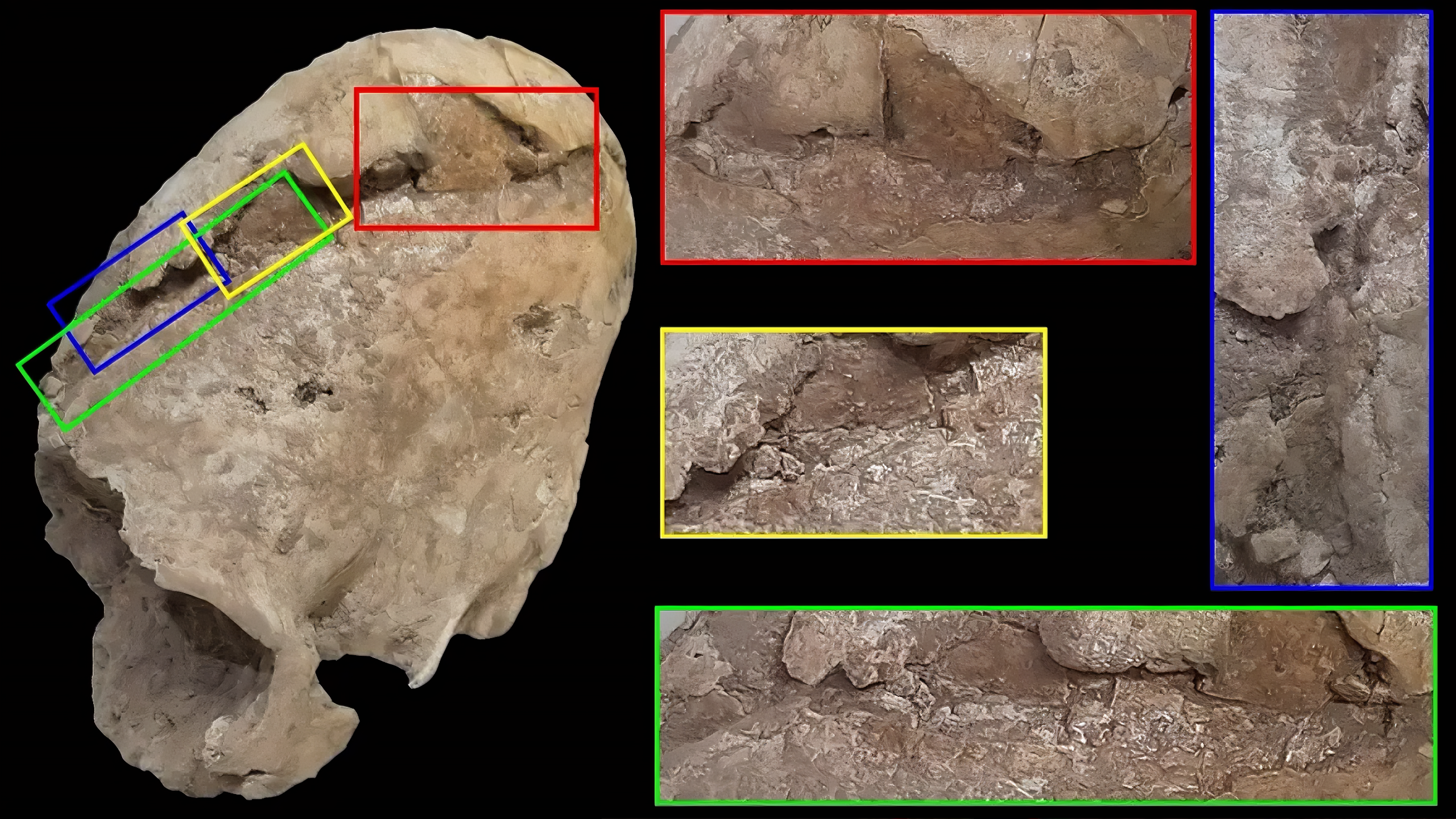 특이한 두개골 중 하나는 머리 왼쪽을 따라 삼각형으로 갈라진, 폭력의 흔적을 지니고 있었다.