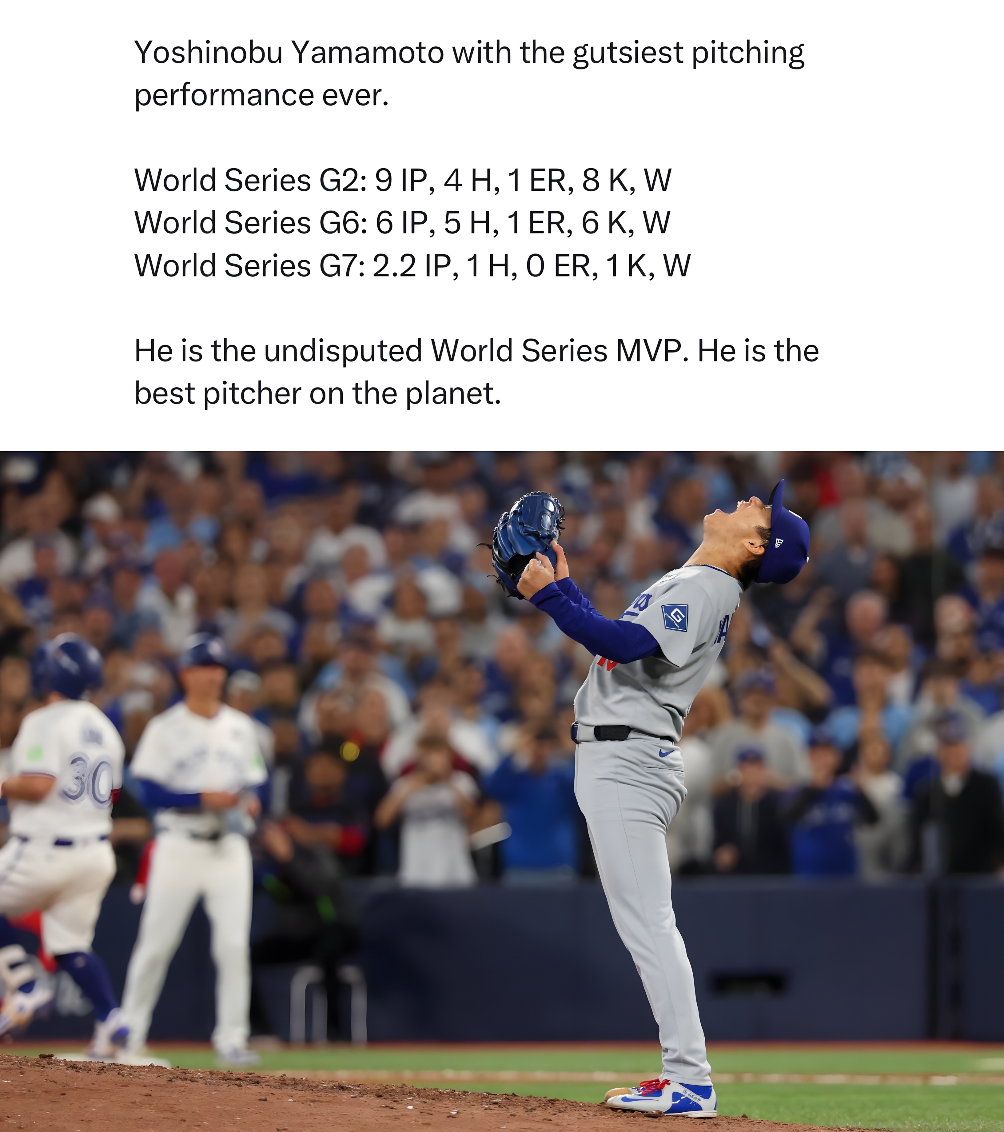 4승까지는 아니지만, 3승을 내리 쓸어담고선 LA 다저스가 MLB 월드시리즈 2연패를 달성케 한 주인공이 있으니 그가 야마모토 요시노부山本由伸Yoshinobu Yamamoto (1998년 8월 17일 생)다.