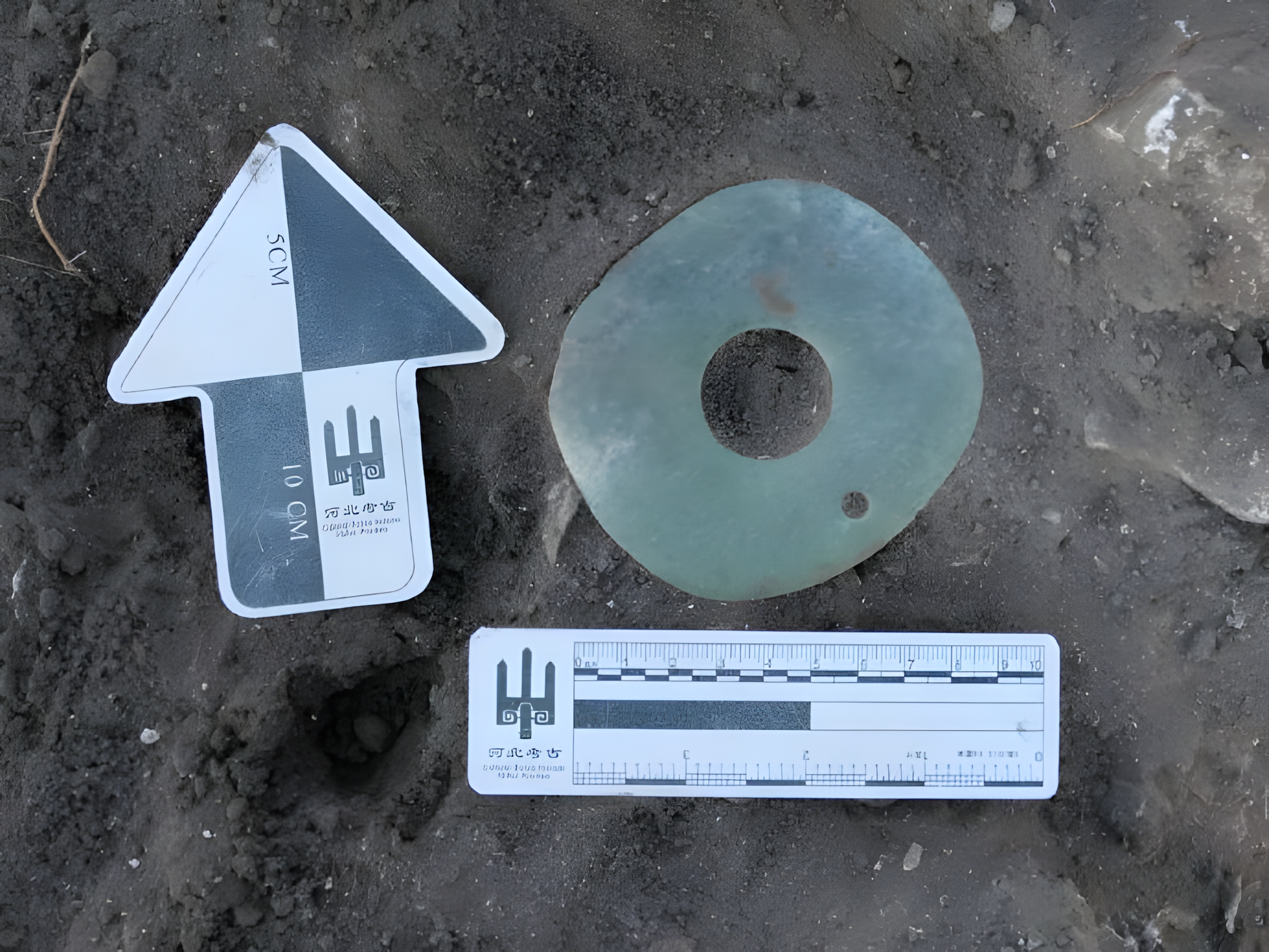 Jade artifacts typical of the Hongshan culture, such as a jade dragon in the shape of a ring and a three-linked jade bi, have been unearthed, along with over 400 pieces (sets) of pottery and stone tools characteristic of the Miaozigou culture of the Hetao region and the Miaodigou culture of the Central Plains.