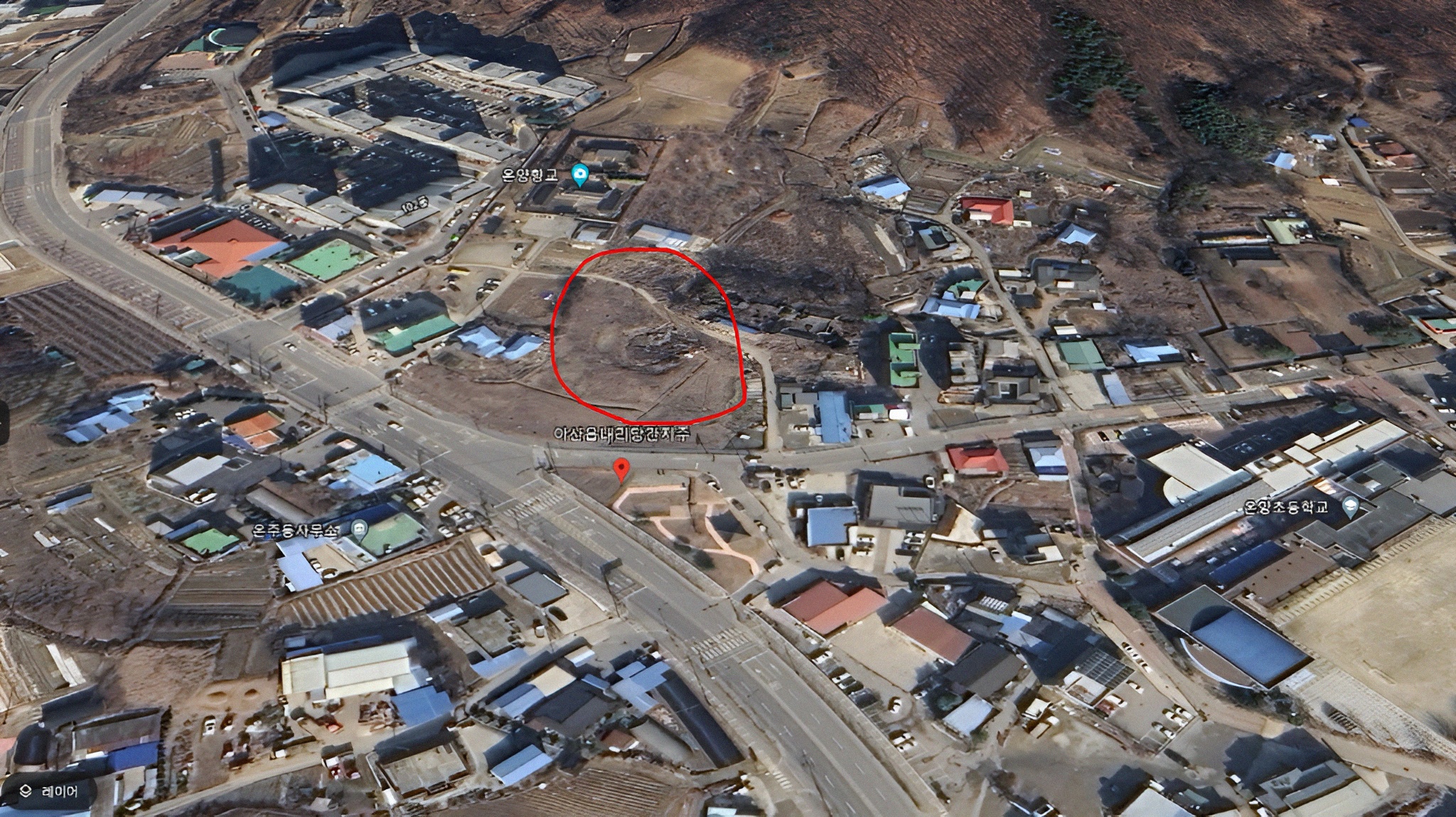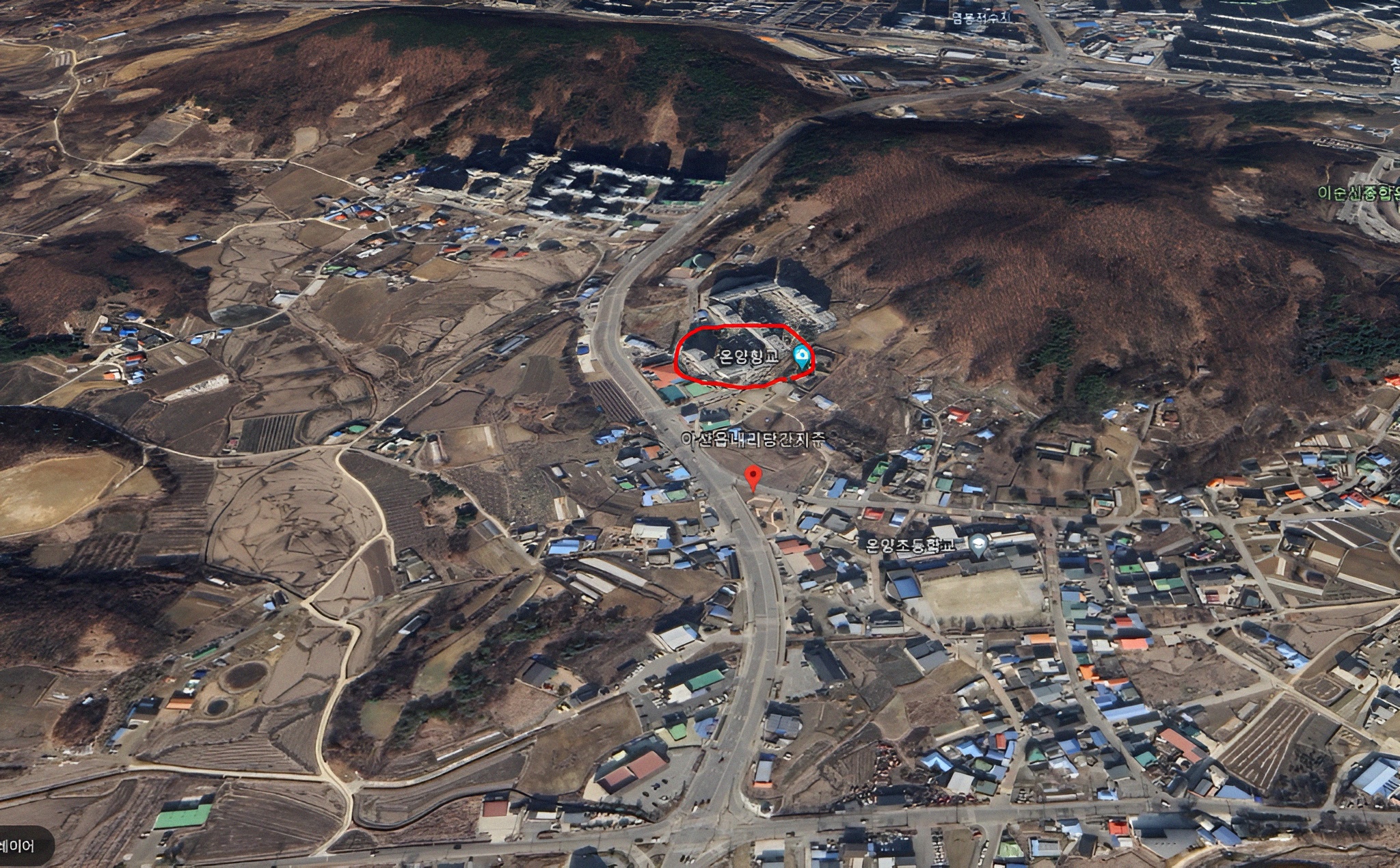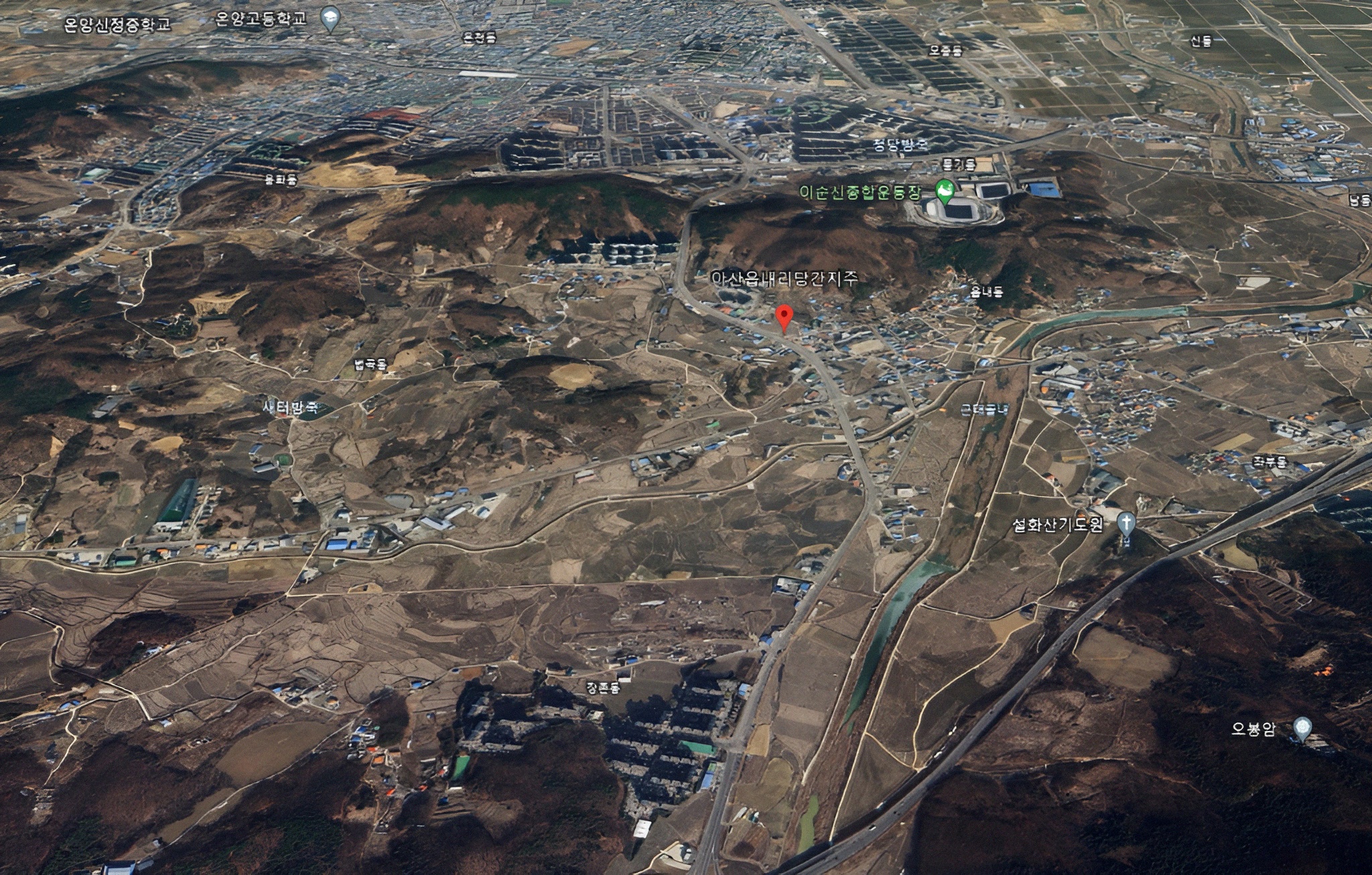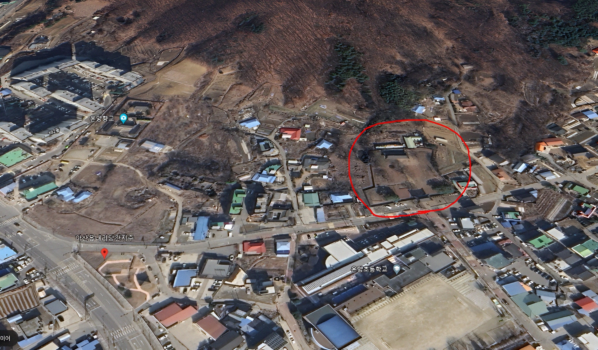 저 앞에 첨부한 구글어스 지도들이 명확히 보여주듯이 저 당간지주, 그리고 그 주변으로 포진하는 온양향교니 온주 관아 건물은 저곳이 바로 적어도 조선시대, 당기면 고려시대에도 저곳이 바로 이 일대를 통치하는 핵심 시설이 있던 곳이요,