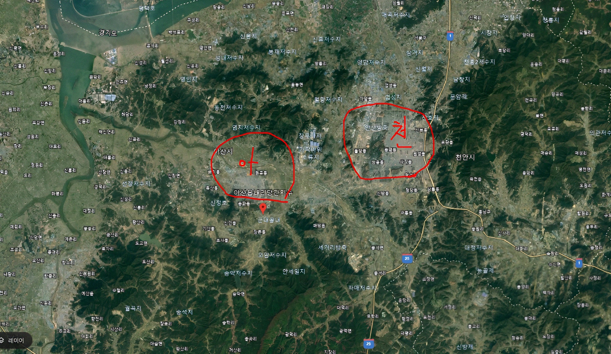 저 차령산맥 주맥과 저 새끼친 산이 둘러친 분지가 바로 전근대 저 일대의 주축도시가 있던 데다.