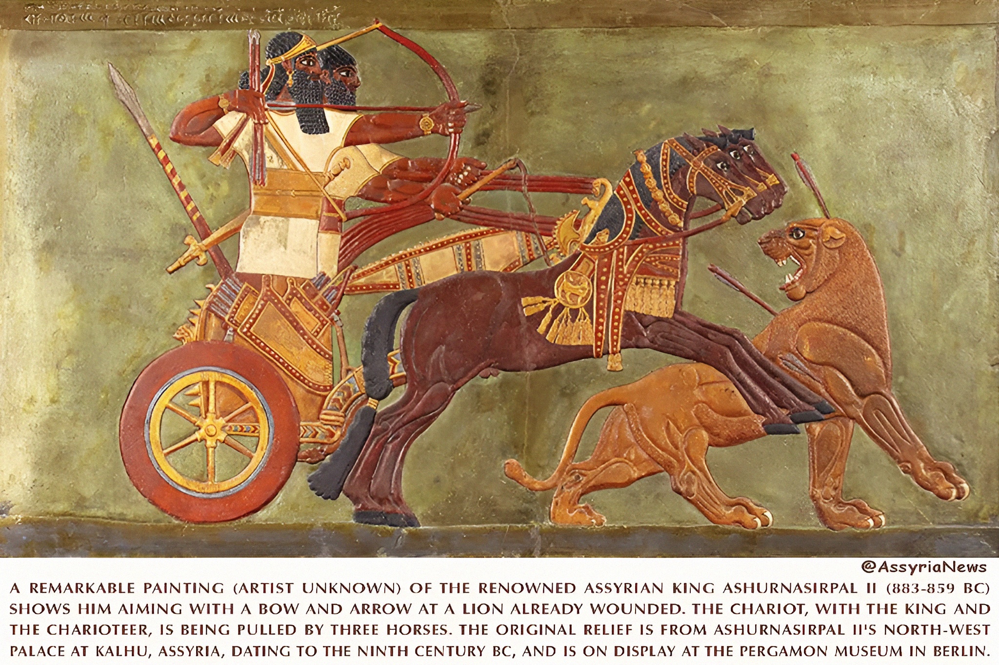 원래 부조는 기원전 9세기로 추정되는 아시리아 칼후 Kalhu 에 있는 아슈르나시르팔 2세의 북서궁 North-West Palace 에서 가져온 것으로 베를린 페르가몬 박물관 Pergamon Museum 에 전시 중이다.