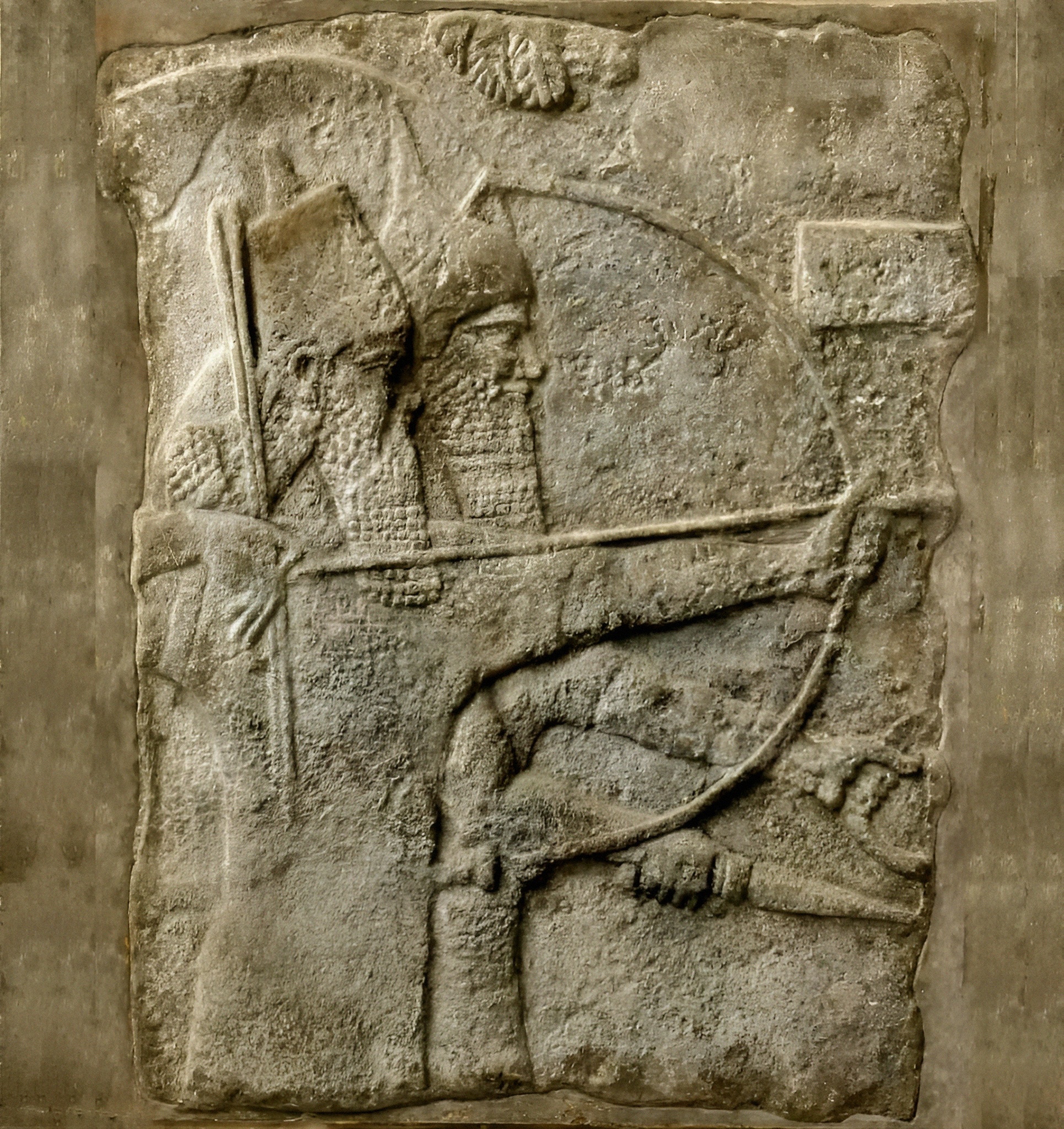 그의 옆에는 한 아시리아 전사가 고전적 뾰족한 아시리아 투구를 쓰고 단검을 들고 있다.