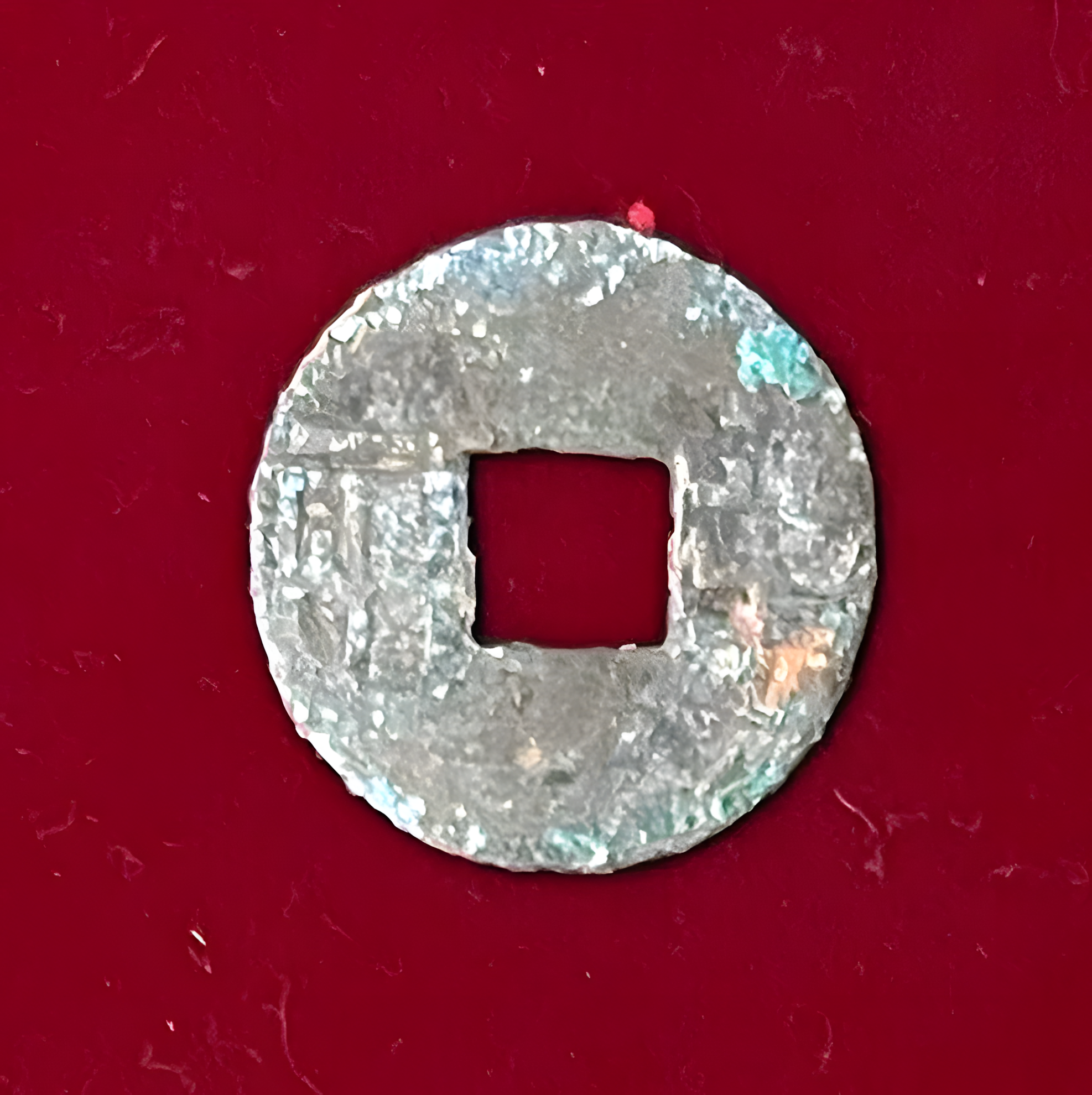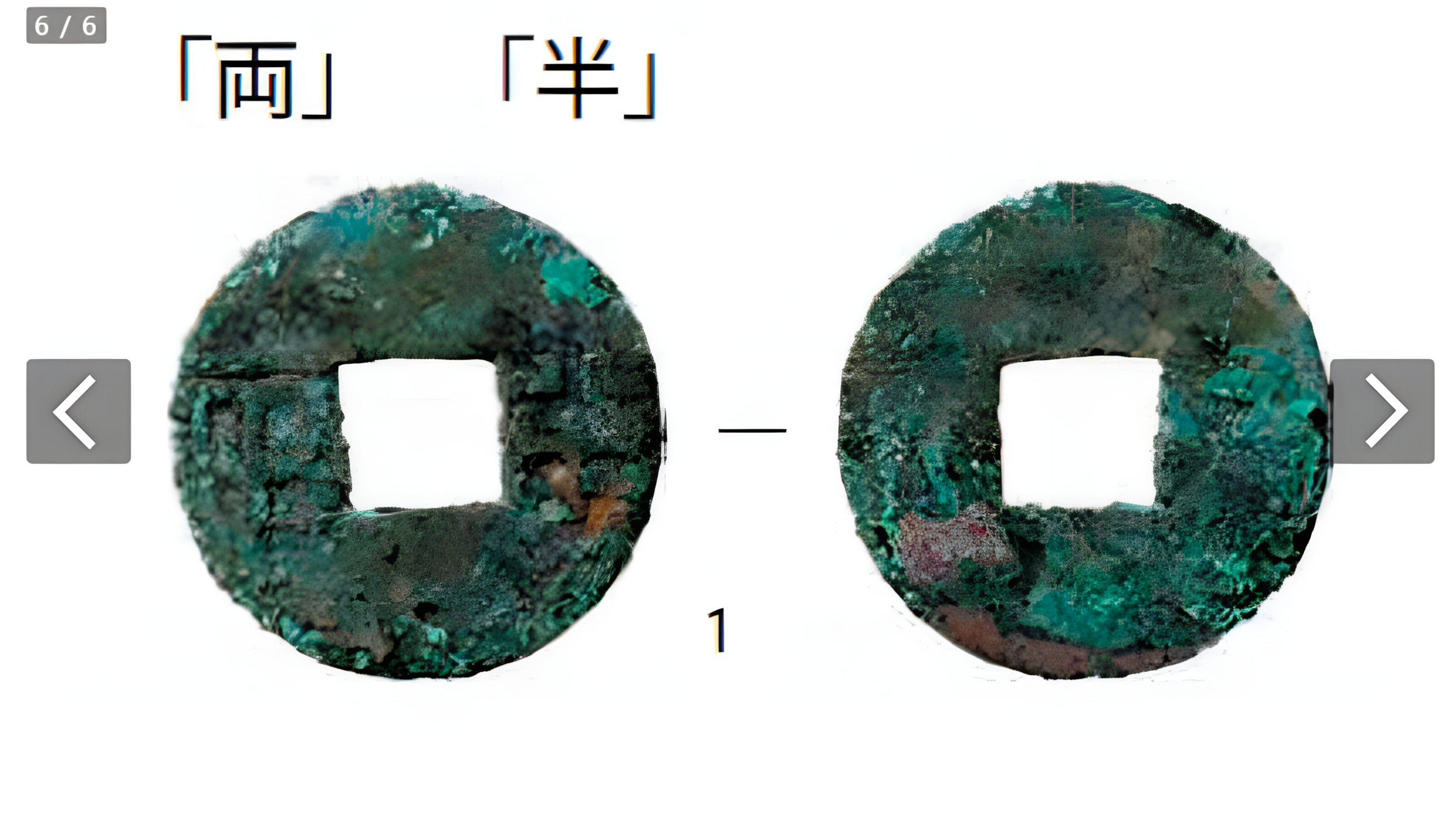 最も古いものは、前漢時代、紀元前175年初鋳造の「半両銭」が1枚確認された。直径2・3センチ、中央部分の四角い穴は一辺7ミリ、厚さ1ミリ。表面の左右に文字が描かれ、左は「両」、右が「半」。