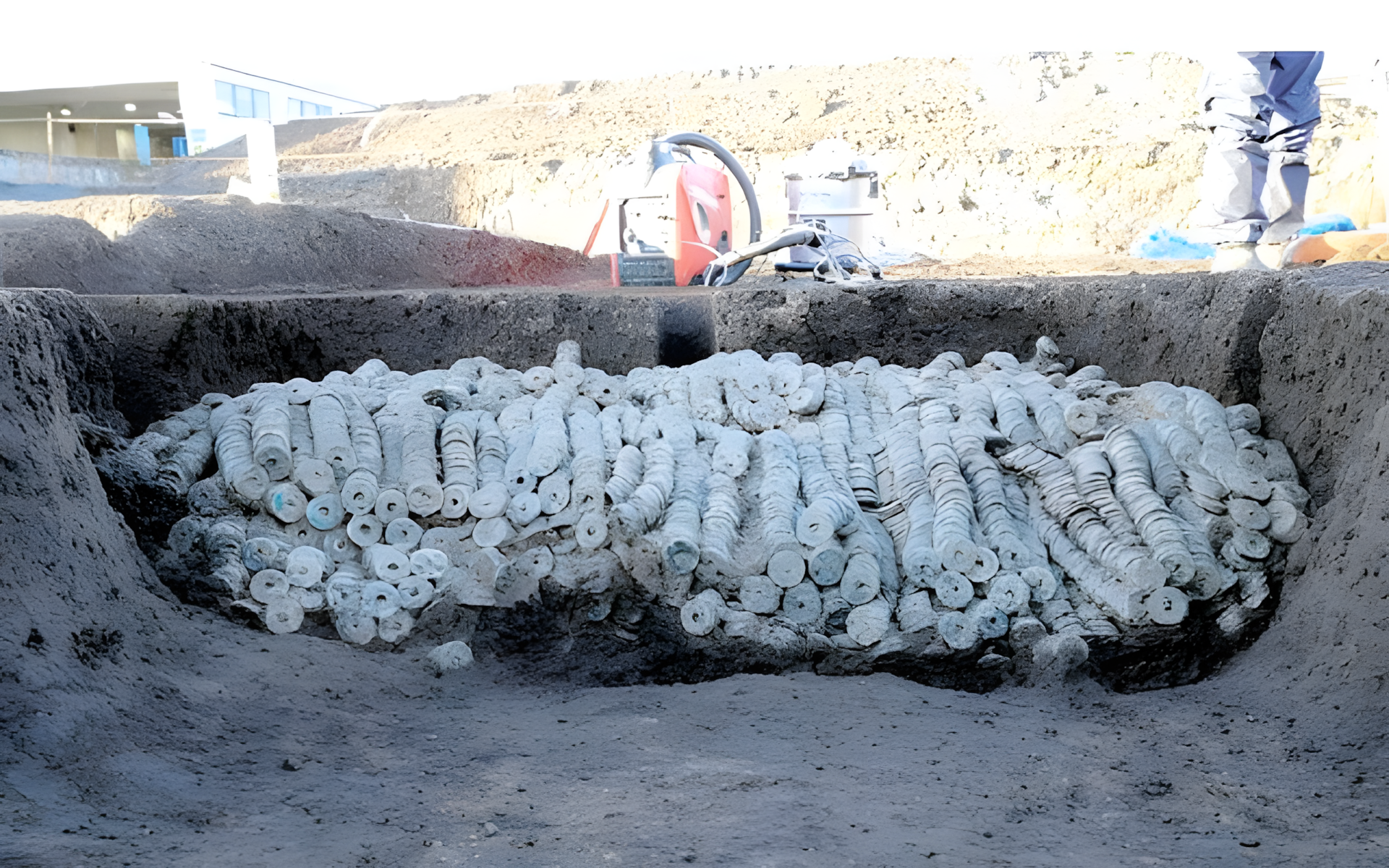 발굴된 동전들은 높이 약 60cm, 너비 약 1m 크기 공간에 무려 1,060점 사시 묶음으로 쌓여 있었다.