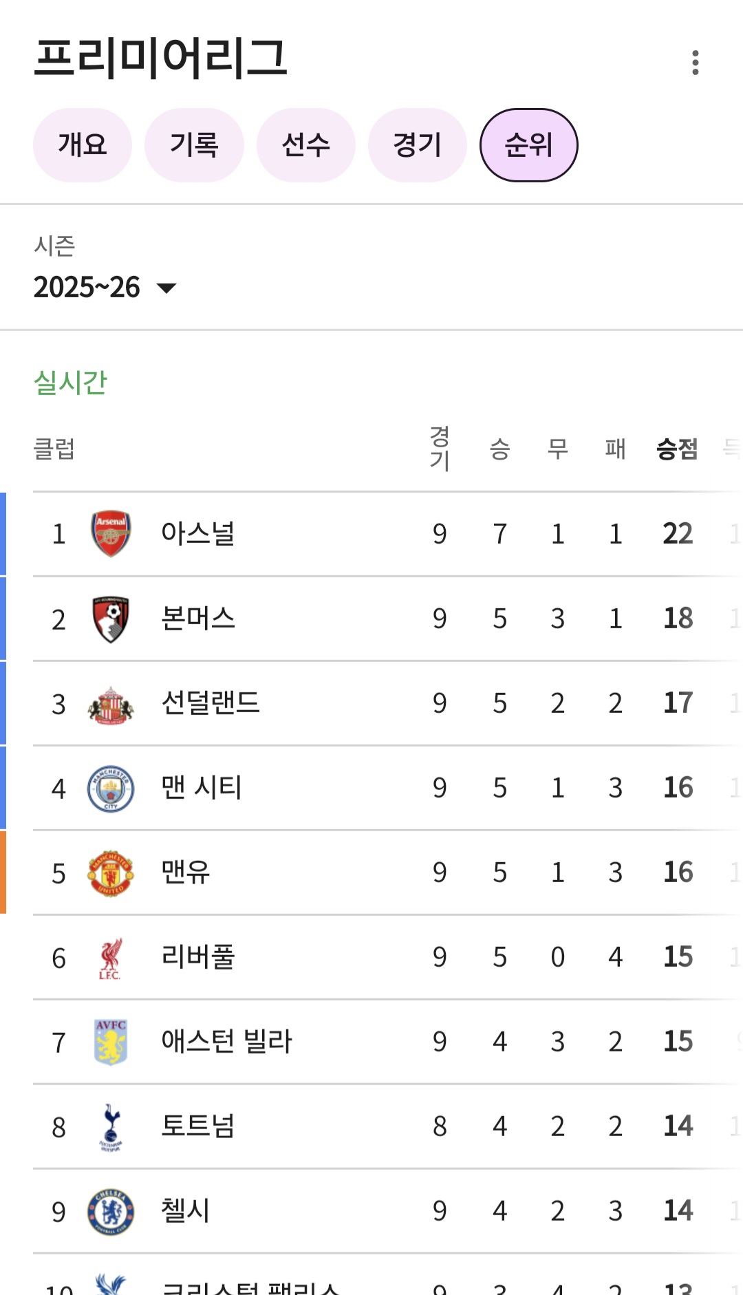 팀에 따라 9라운드를 치르지 않기도 했지만 epl 이번 25-26시즌은 이제 고작 팀별 38라운드를 치르는 장기레이스에서 이제 겨우 사분지일을 자난 상황에서 순위표가 복잡하다.