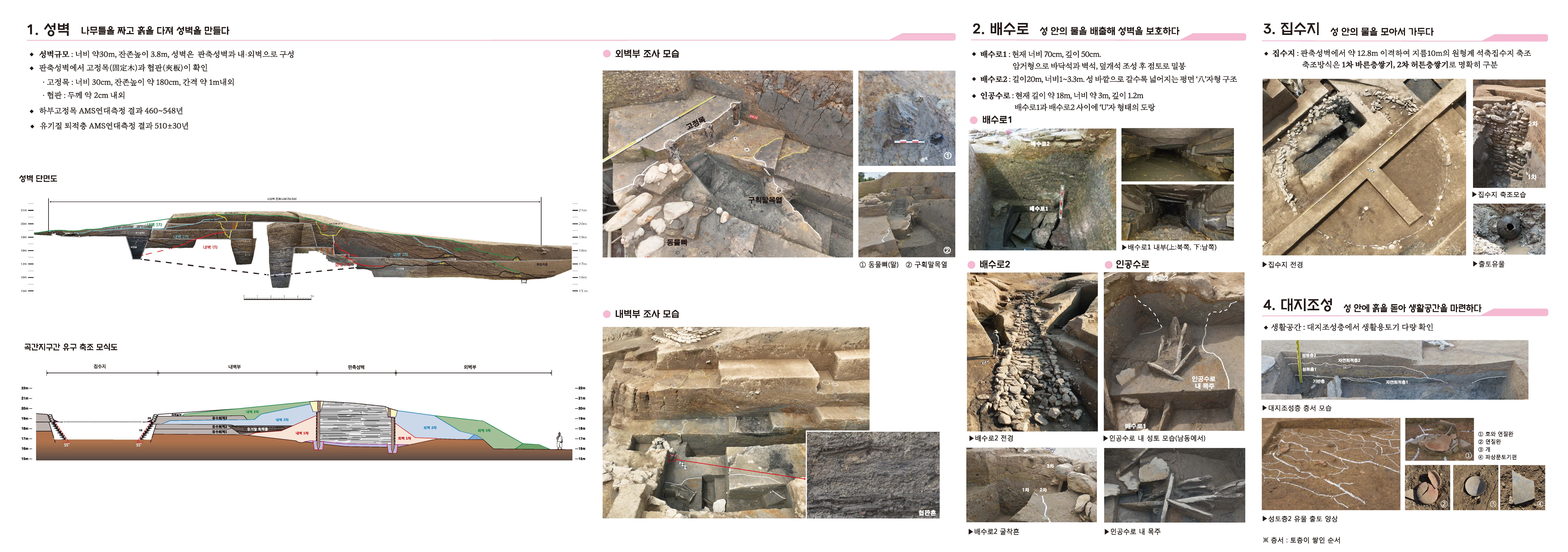 특히 이번 "조사에서는 땅 속에 조성된 도랑 형태의 배수로와 성 바깥으로 갈수록 넓어지는 나팔 모양으로 조성된 배수로 등 성벽을 통과하는 각기 다른 높이의 배수로들을 확인하는 성과가 있었다"고 한다.