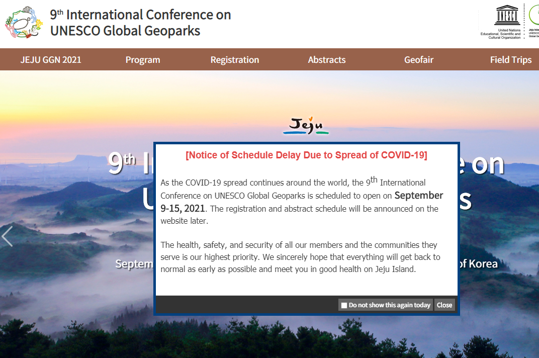 As the COVID-19 spread continues around the world, the 9th International Conference on UNESCO Global Geoparks is scheduled to open on September 9-15, 2021. The registration and abstract schedule will be announced on the website later.