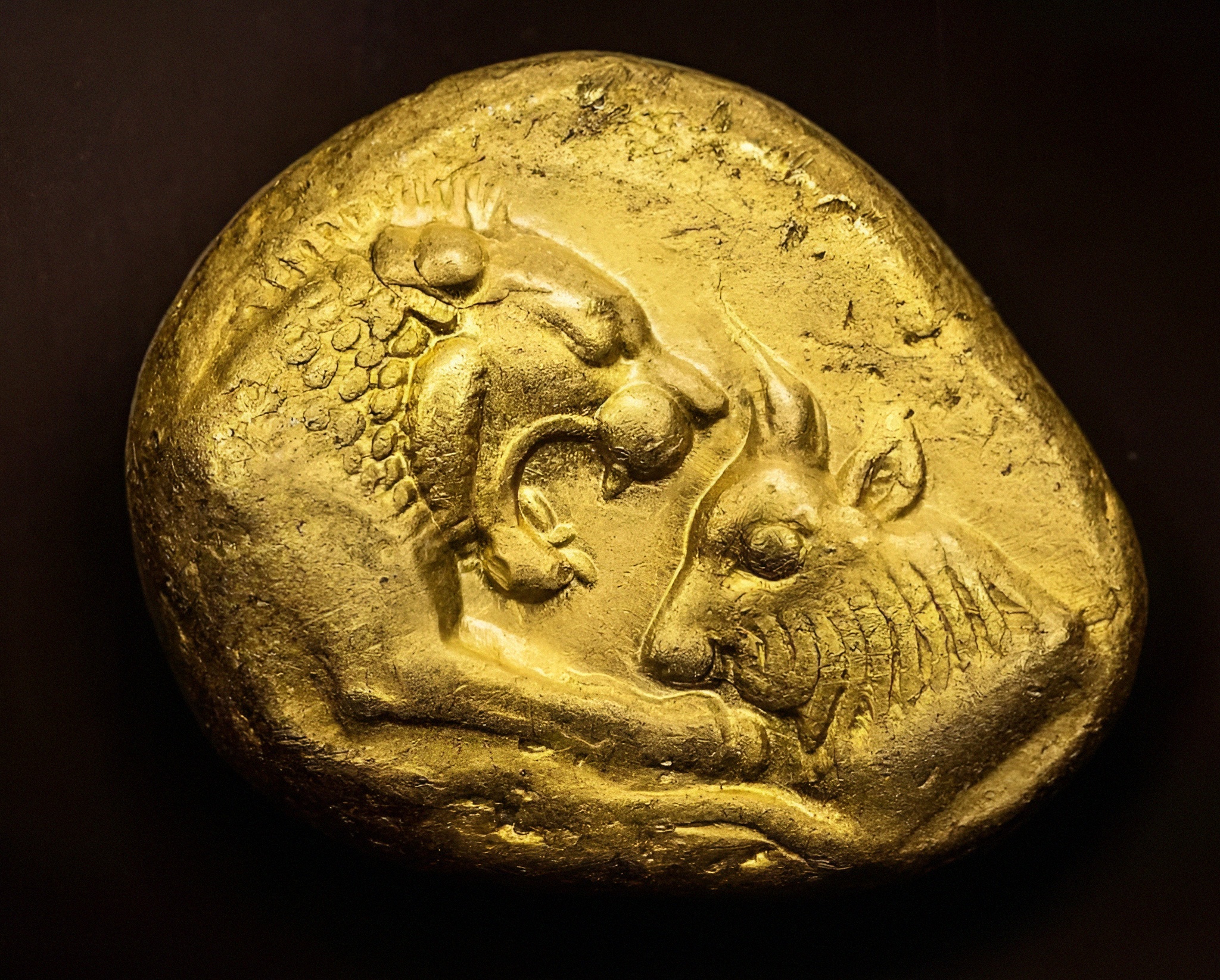일렉트럼 electrum 을 순은과 금으로 분리하는 정제 과정을 개척한 크로이소스 Croesus 왕 치하 리디아인들 Lydians 은 기원전 550년 무렵 혁명적인 바이메탈 주화 시스템 bimetallic coinage system 을 도입한다.