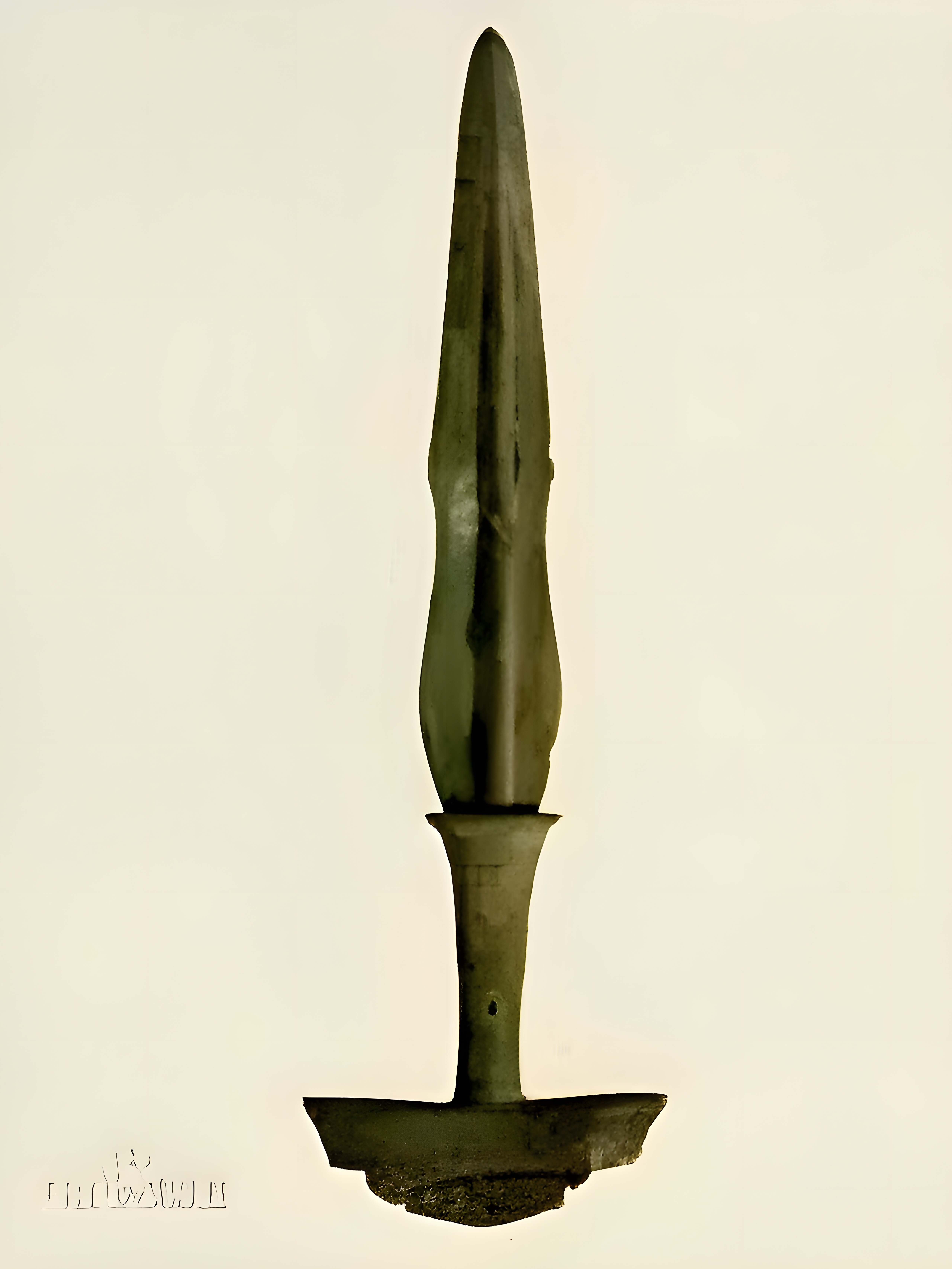 由剑身、剑柄组成。剑身中间凸起柱状脊,两刃弧曲成琵琶形,刃尖锐利,脊下出短茎。剑柄为倒T形,由柄筒、柄盘构成,柄筒上端呈喇叭口,刻铸几何纹图案,下与柄盘相接;柄盘外开框戳刻密聚点状纹,内有两块矿石拼成的枕状器,以铜质贴叶加固,贴叶上刻叶脉纹。