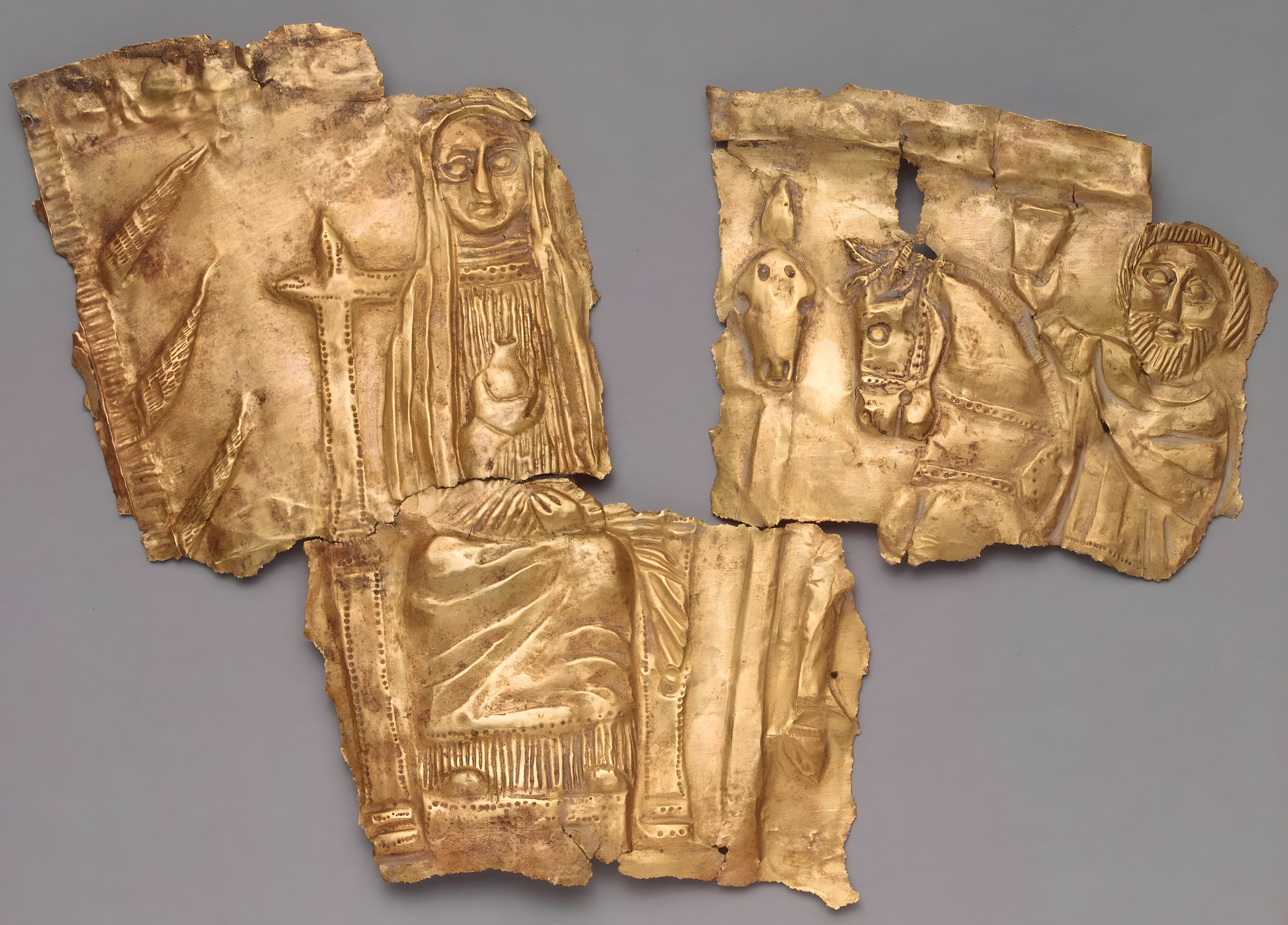 저 문양은 보다시피 금판에다가 양각했다. 그 문양은 리톤 하나를 든 수염 난 기수가 손에 둥근 그릇을 들고 있는 왕좌에 오른 여성에게 다가가는 장면을 포착한다.