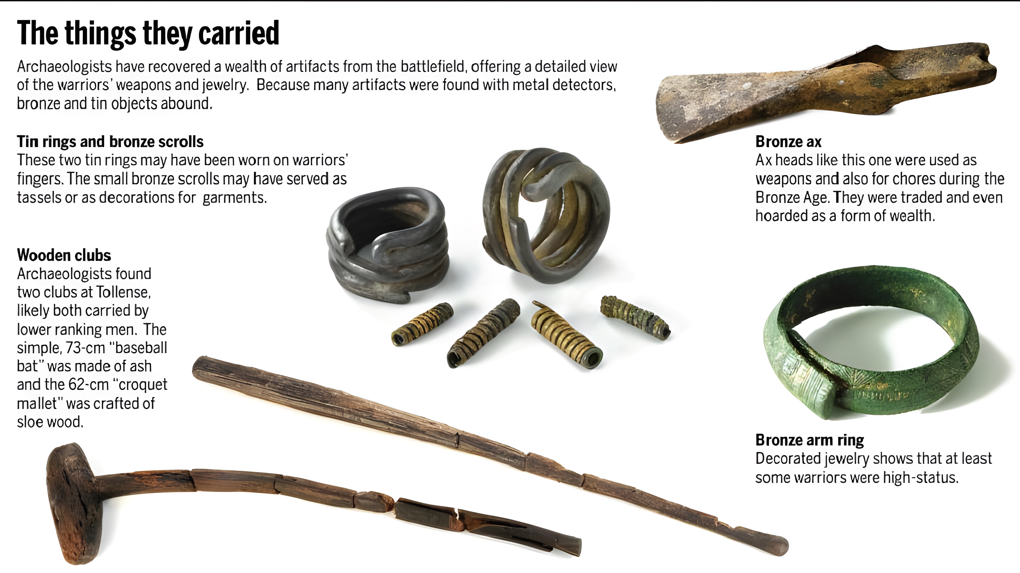 이 전투에서 청동 혹은 돌로 끝을 장식한 화살이 근거리에서 발사되어 두개골을 꿰뚫고 젊은이들 뼈 깊숙이 박혔다. 고위 전사들이 탄 말은 진흙 속에 쳐박혀 치명적인 창에 맞고 죽었다.