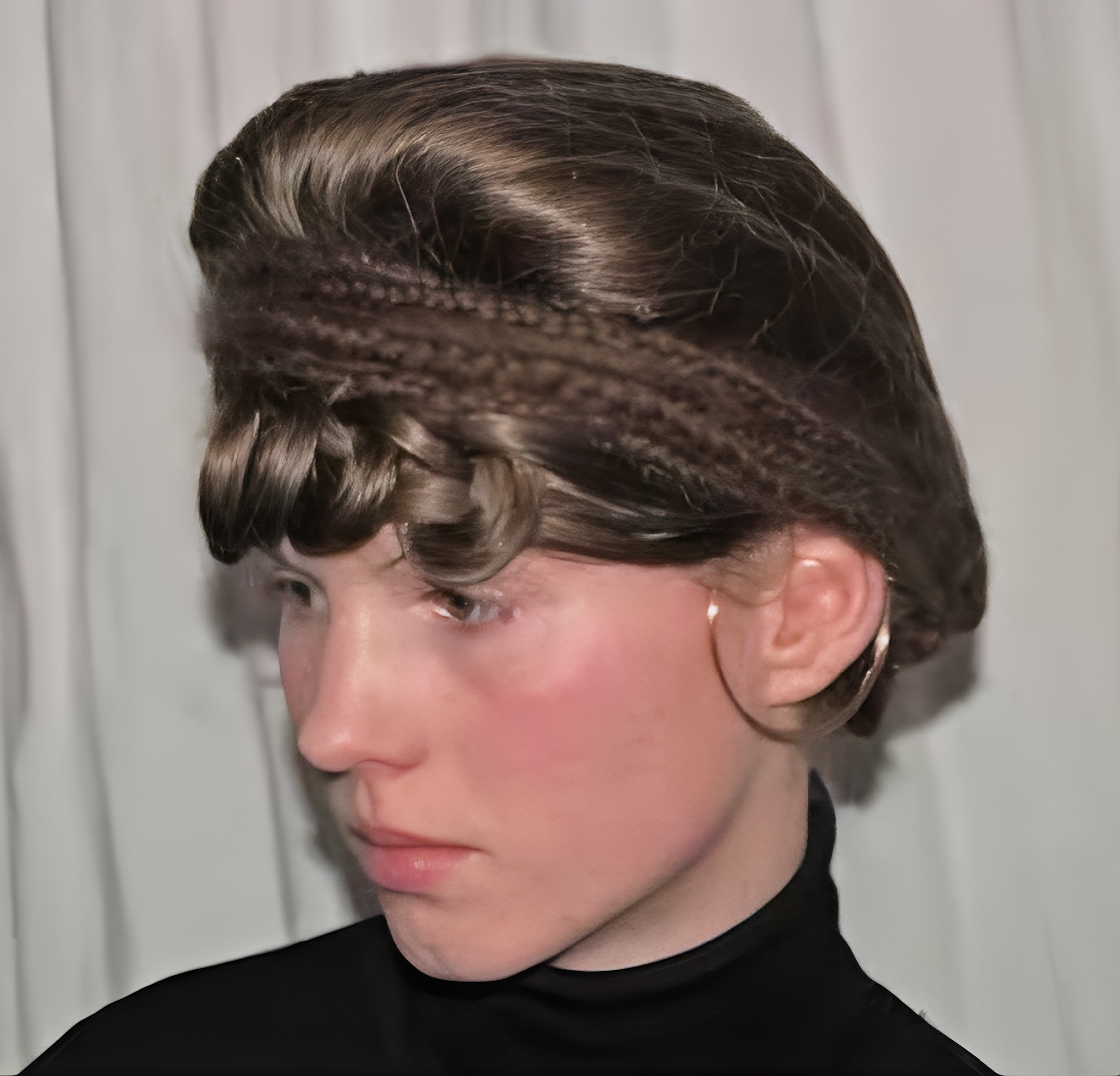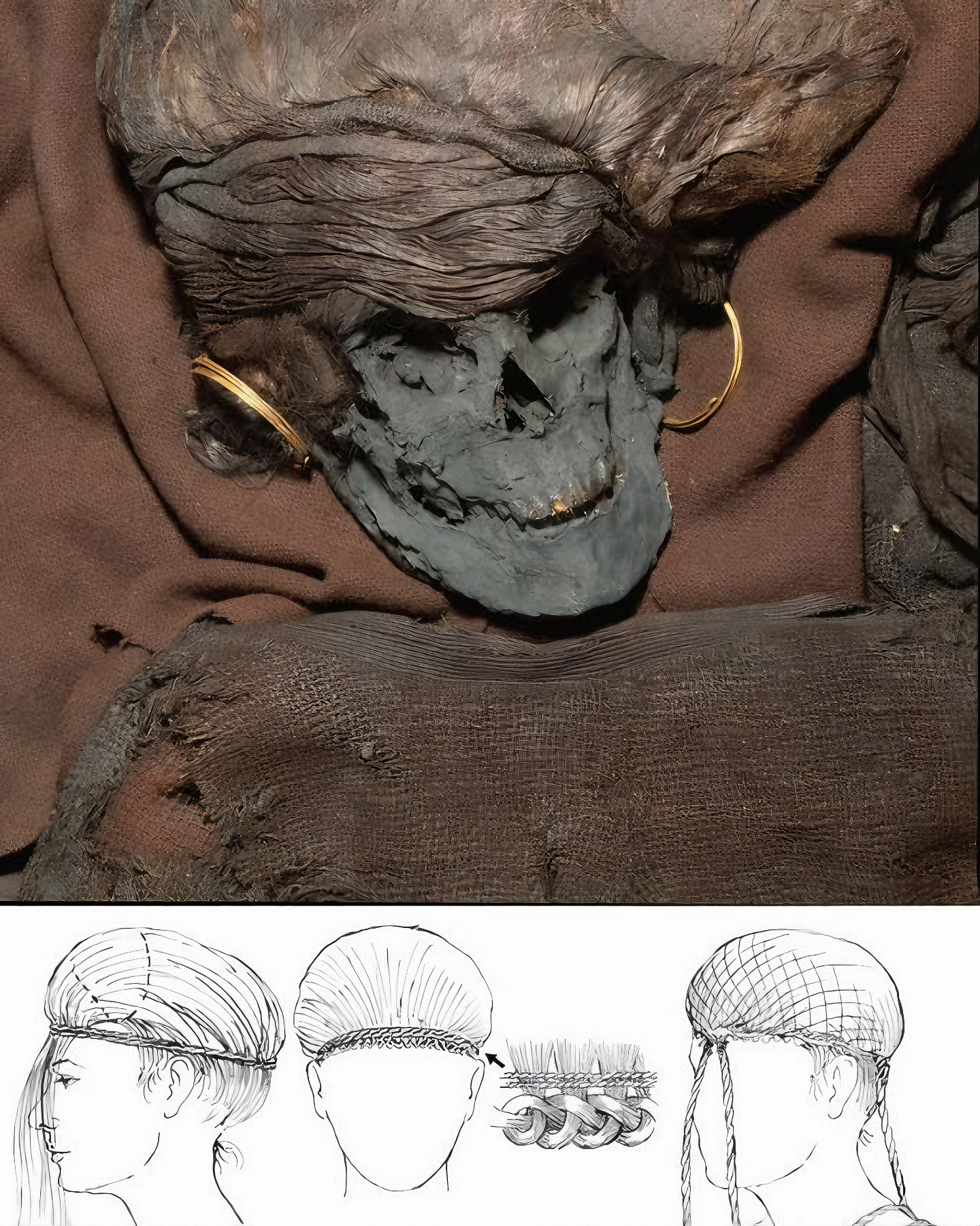 머리카락은 정교한 헤어스타일을 했으며, 그 위에는 스프랭 기법 sprang technique으로 만든 말털 머리망horse hair hairnet 이 덮여 있었다.