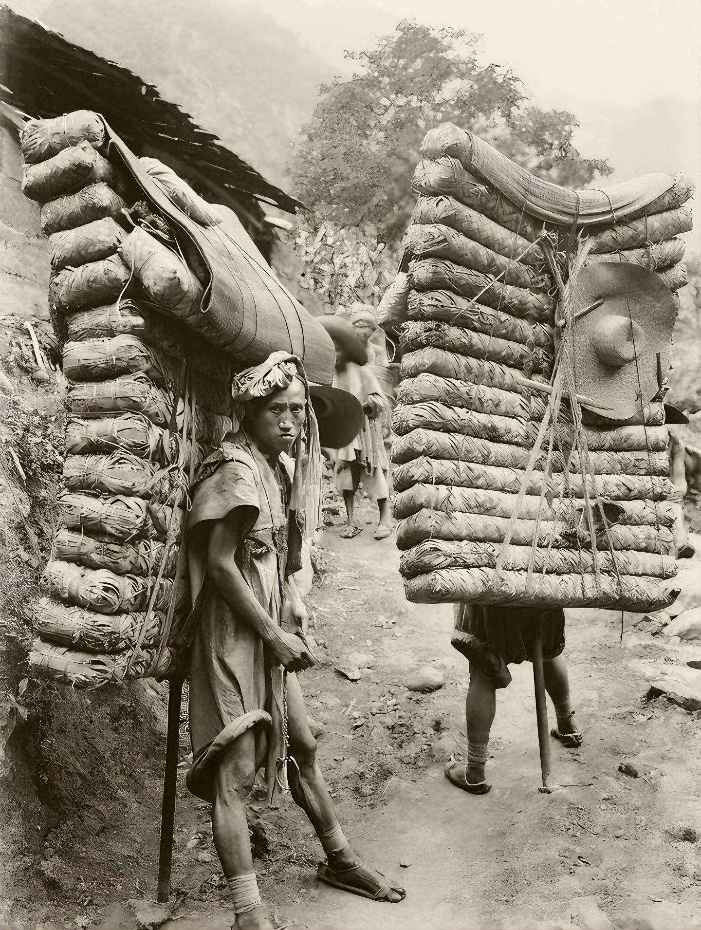 티베트로 향하는 압축차 꾸러미를 나르는 짐꾼들, 중국 쓰촨성 [차마고도] 1908년