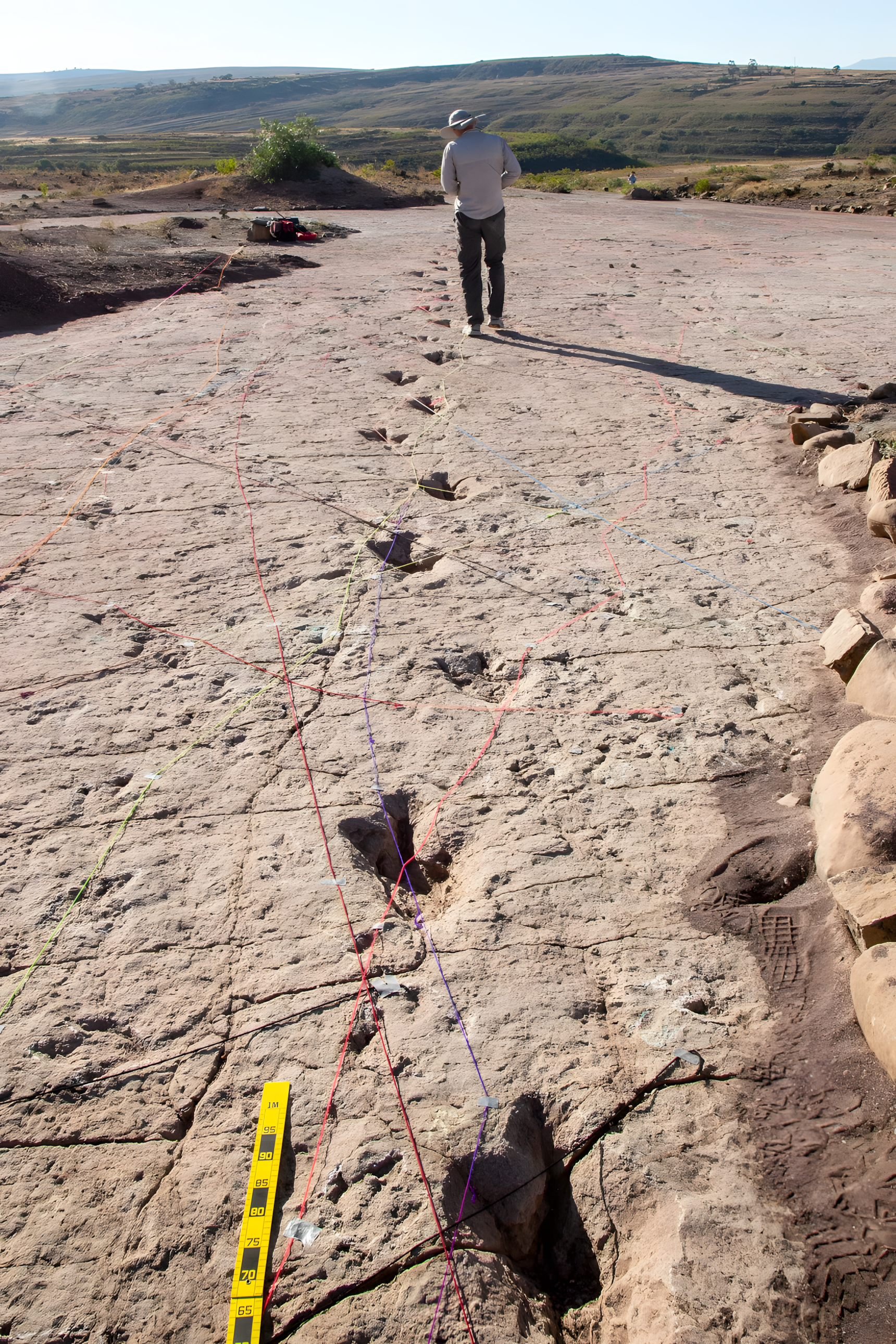 이 붐비는 길을 따라 이동하던 세 발가락을 지닌 두 발로 걷는 육식 공룡인 수각류theropods는 수천 개 발자국 화석을 남겼다.