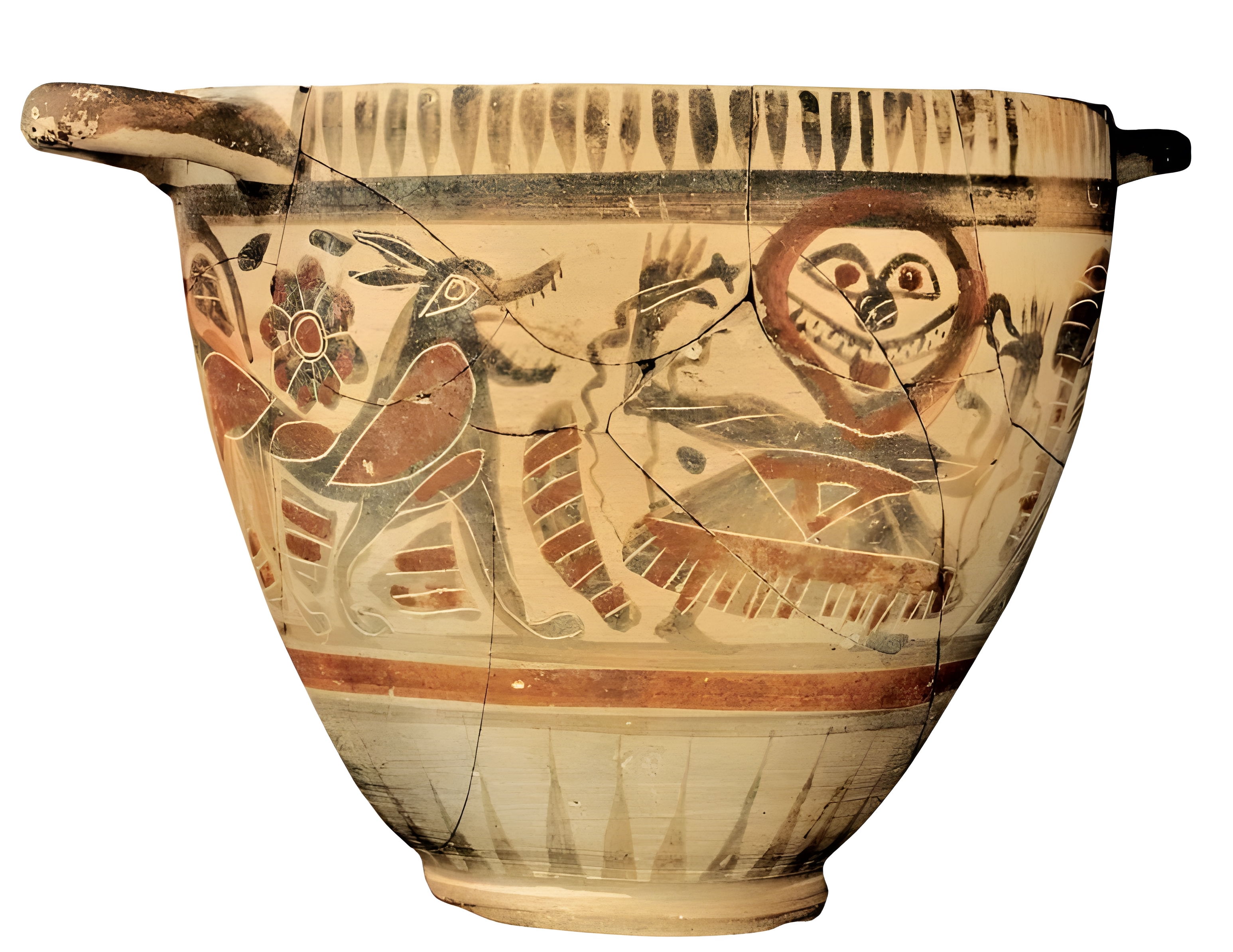 Magna Graecia (Great Greece): Etruscan-Corinthian kotyle by the Painter of the Bad Wolf; figures emerge from the background among which that of the Gorgon; from Pontecagnano, tomb 856; beginning 6th century BC: clay, polychrome; h 17.1 cm; diameter 19,7 cm, Pontecagnano, Museo Nazionale del 'Agro Picentino - Art of the Great Greece: clay vase decor a head of Gorgona and a wolf with an open mouth. Painting by the Painter of the Mechant Wolf (Lupo cattivo) From Pinte Cagnano, Italy. Beginning of the 6th century BC. Dim. 17,1x19,7 cm Pontecagnano, Museo Nazionale del 'Agro Picentino (inv. 35272)