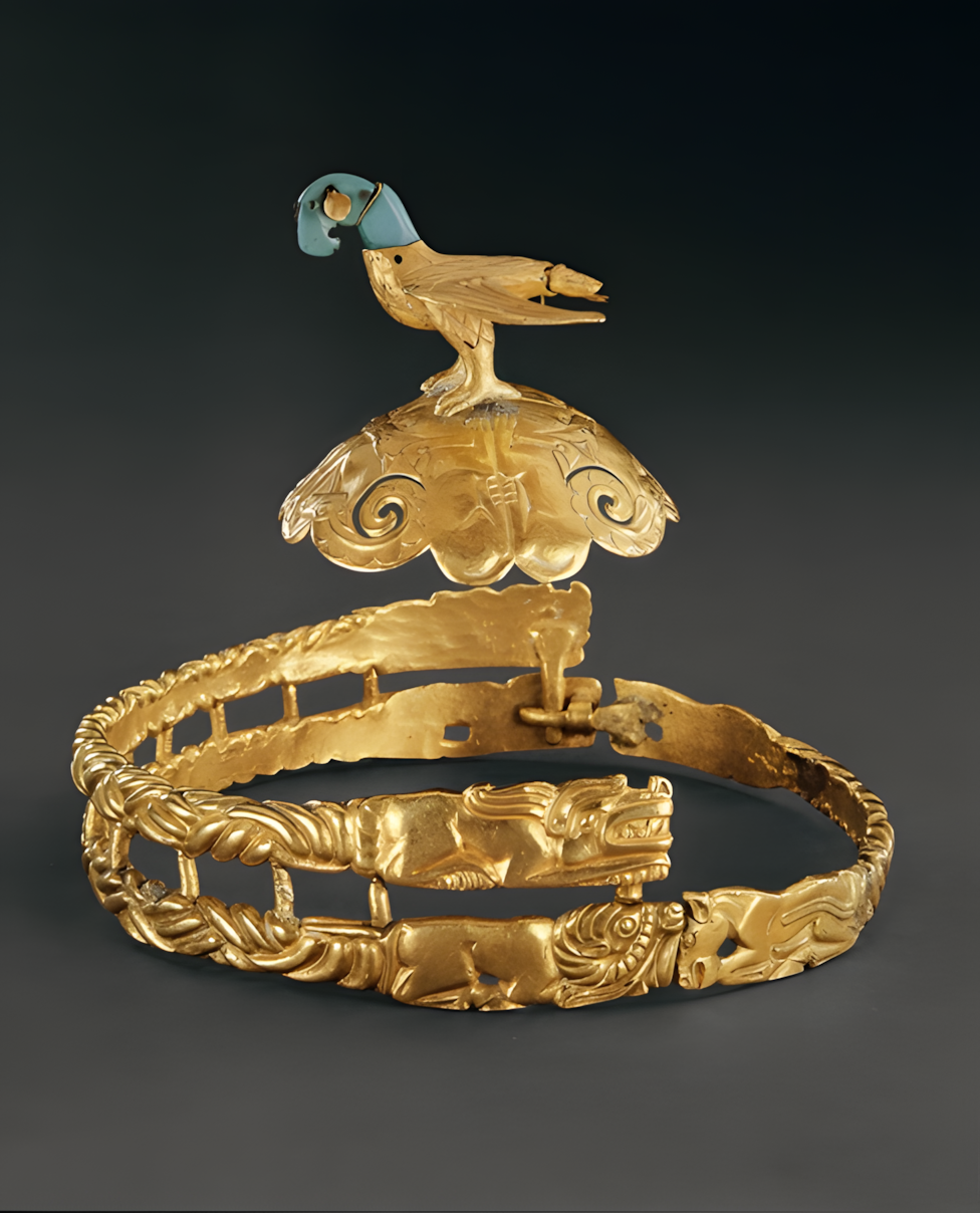 The crown is topped with a soaring eagle, whose head and neck are made of turquoise and connected by gold wire, and can sway left and right; the surface of the crown is decorated with reliefs of wolves chasing sheep, and the ends of the crown band are decorated with animal patterns such as reclining tigers, reclining horses, and reclining sheep. This crown is the only gold crown ornament of a Xiongnu chieftain discovered to date, and is called "Hu crown". Its dynamic structure and animal patterns reflect the characteristics of nomadic culture on the grassland [3] [7] [11]. During the Warring States period, the Hu crown was introduced to the Central Plains along with "Hu clothing and horse archery". The eagle on the crown was changed to a red pheasant with a long tail to adapt to the customs of the Central Plains.