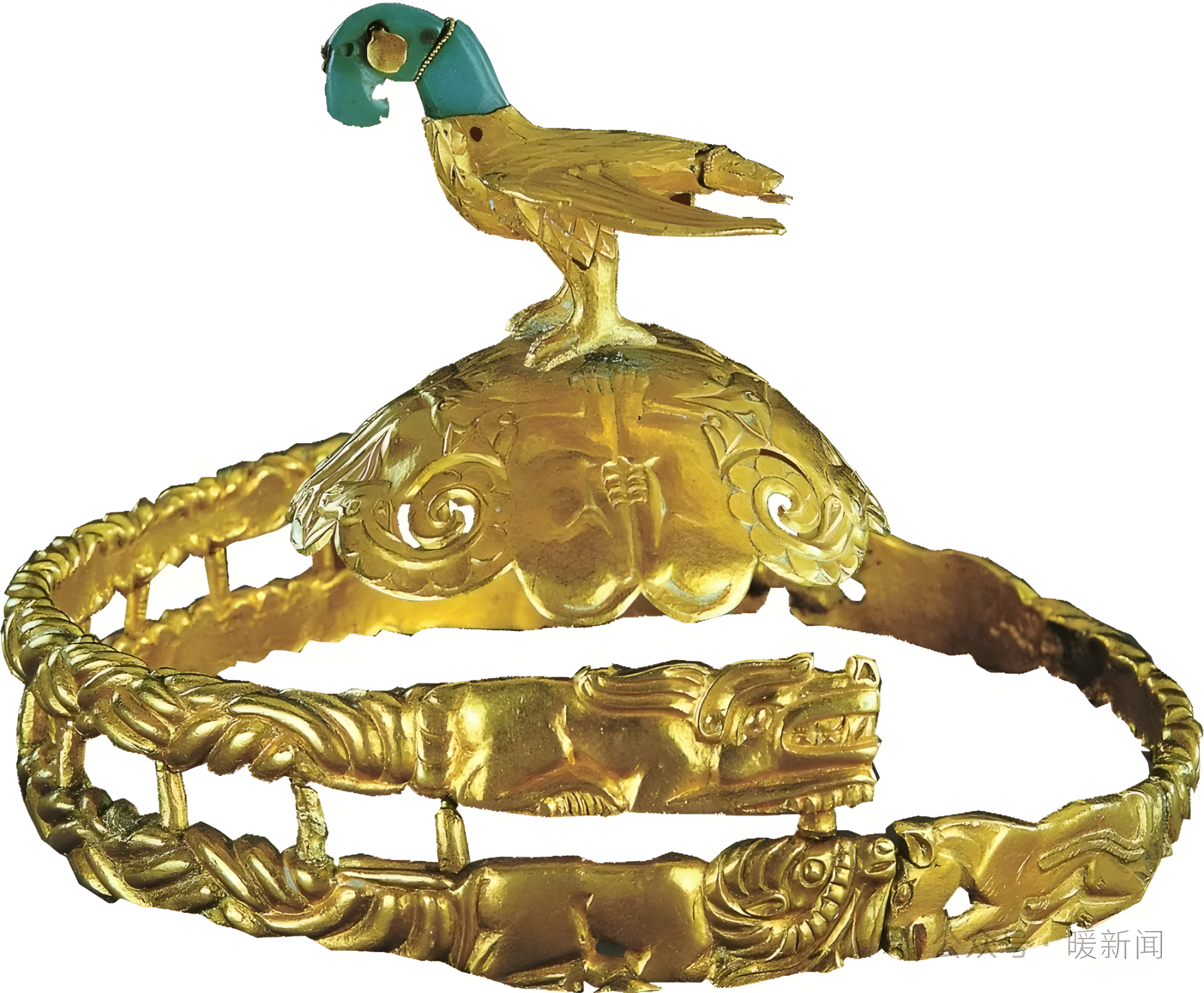 The eagle-topped gold crown ornament is a crown ornament of the Xiongnu nobles during the Warring States period. It was unearthed in 1972 from the Xiongnu tomb in Aluchaideng, Hangjin Banner, Inner Mongolia, and is now housed in the Inner Mongolia Museum. It is known as the "treasure of the grasslands". The crown ornament consists of an eagle-shaped crown top, a hemispherical crown top, and three crown bands. It is 7.3 cm high, 30 cm long, and weighs 1394 grams. It was cast using techniques such as hammering, wire drawing, and inlaying. The main body is made of gold and represents the highest level of precious metal craftsmanship of the northern ethnic groups in my country during the Warring States period.