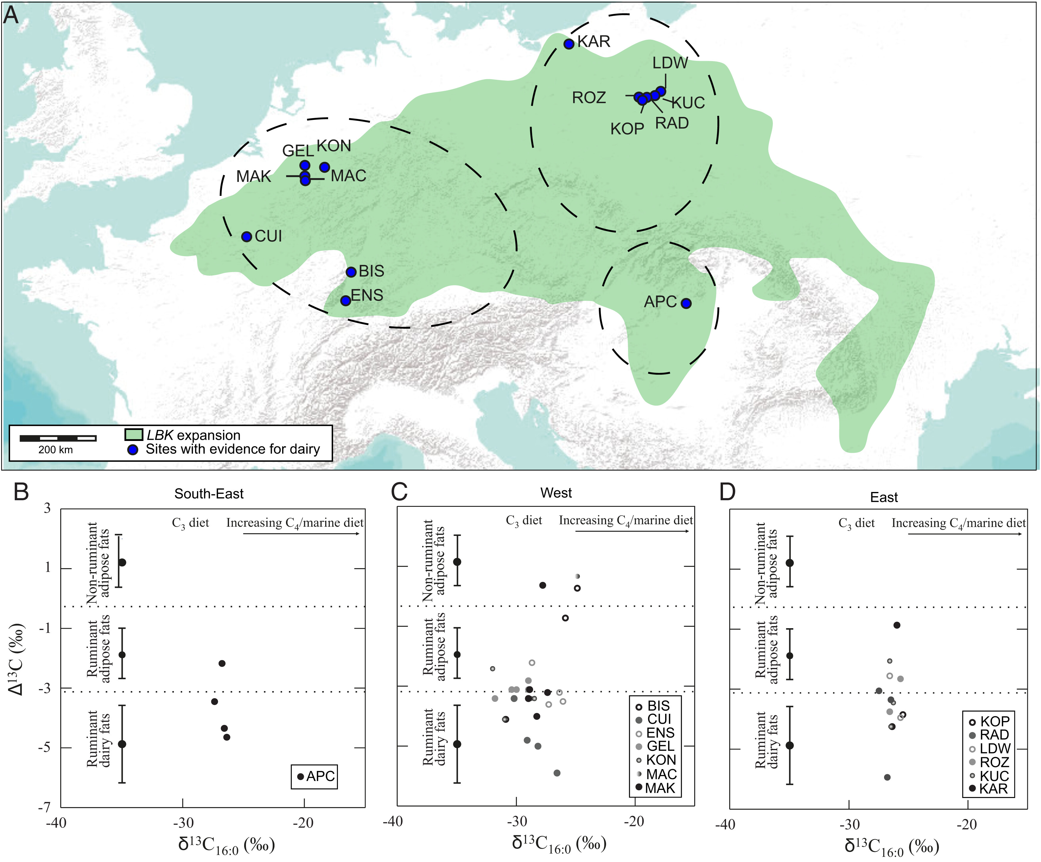Emmanuelle Casanova et al, Dating the emergence of dairying by the first farmers of Central Europe using 14 C analysis of fatty acids preserved in pottery vessels, Proceedings of the National Academy of Sciences (2022). DOI: 10.1073/pnas.2109325118