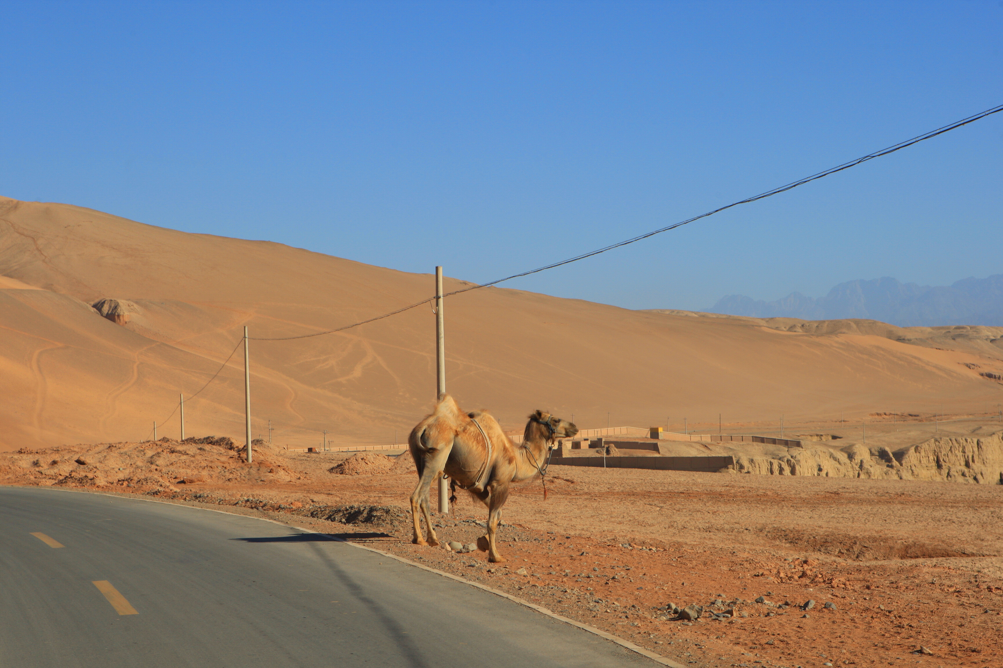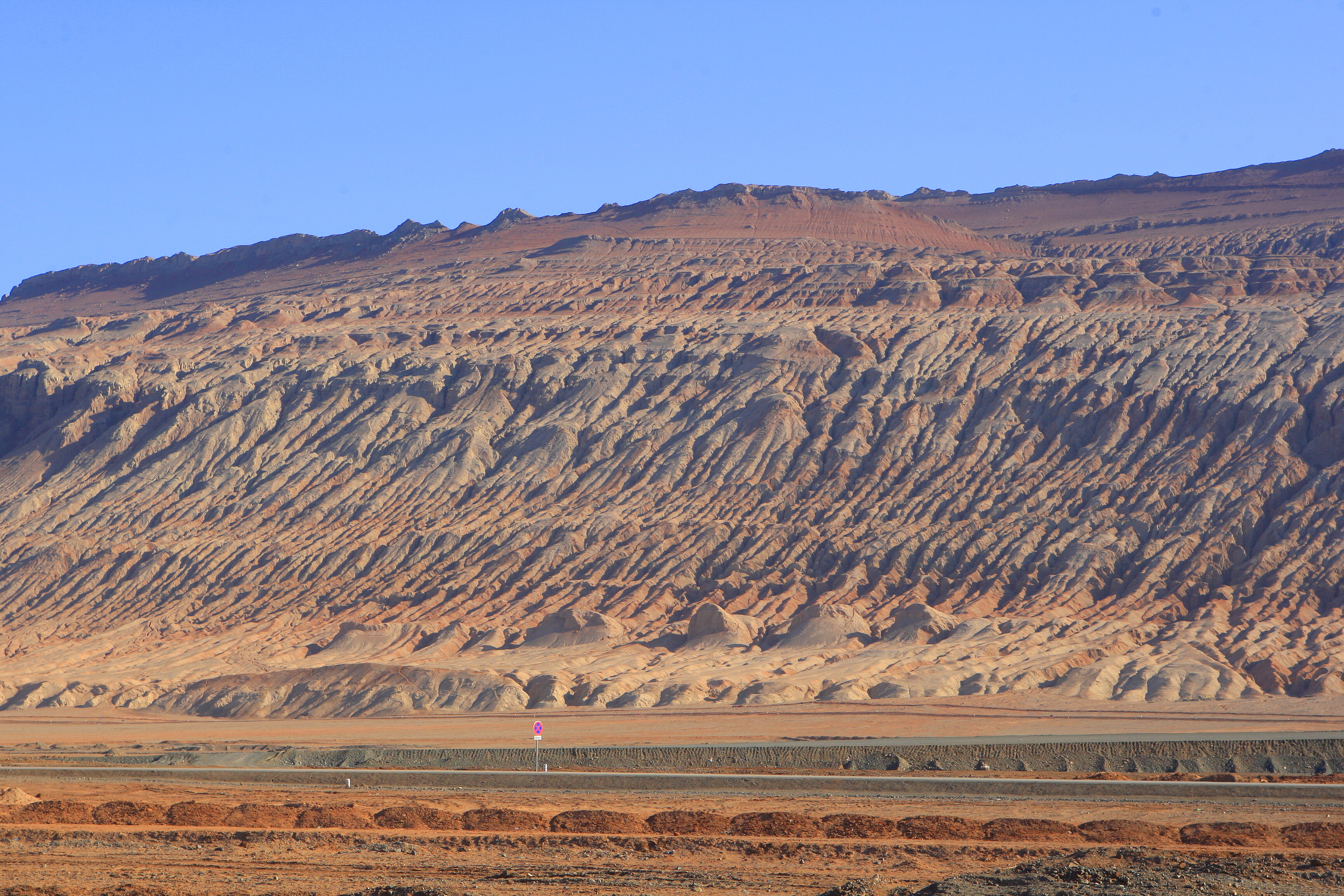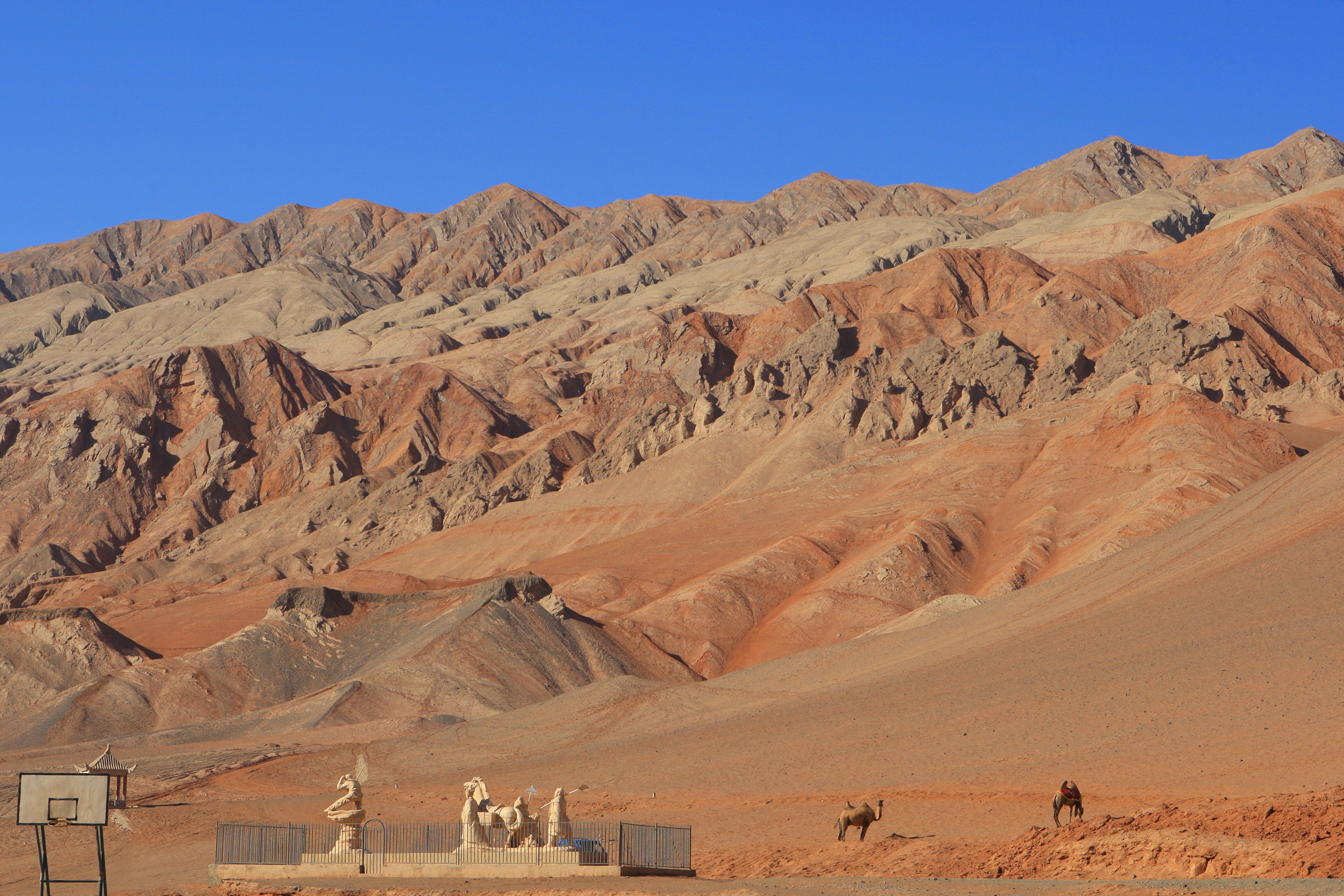 The Flaming Mountains (火焰山 화염산) or Gaochang Mountains, are barren, eroded, red sandstone hills in the Tian Shan of Xinjiang. They lie near the northern rim of the Taklamakan Desert and east of the city of Turpan. Their striking gullies and trenches caused by erosion of the red sandstone bedrock give the mountains a flaming appearance at certain times of the day.