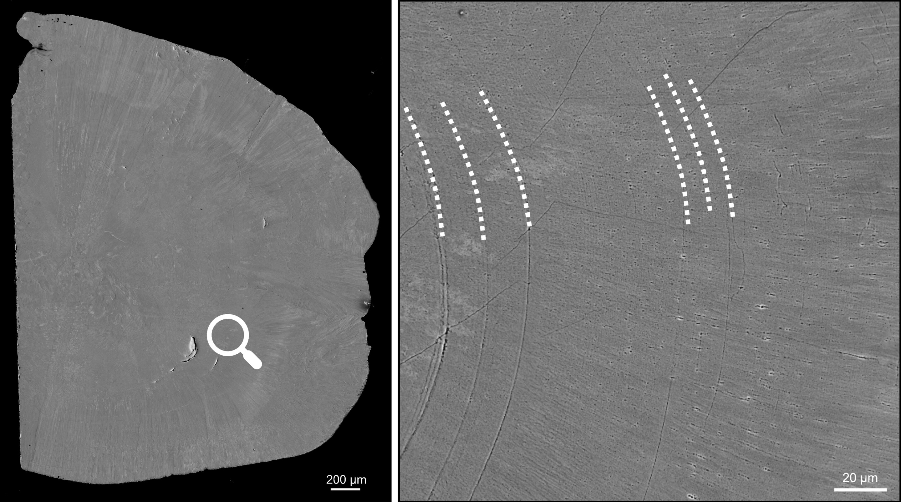 최근 연구에서 빈 대학교 고생물학자 팀은 정밀한 전자 현미경 기술을 사용하여 가장 미세한 성장 고리까지 볼 수 있음을 보여주었다.